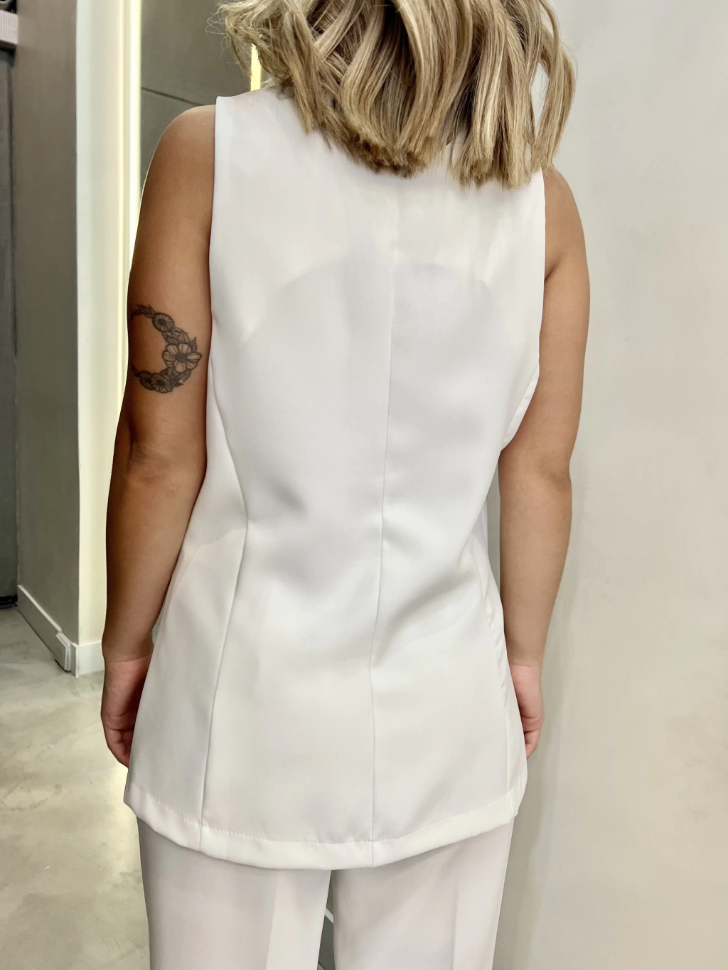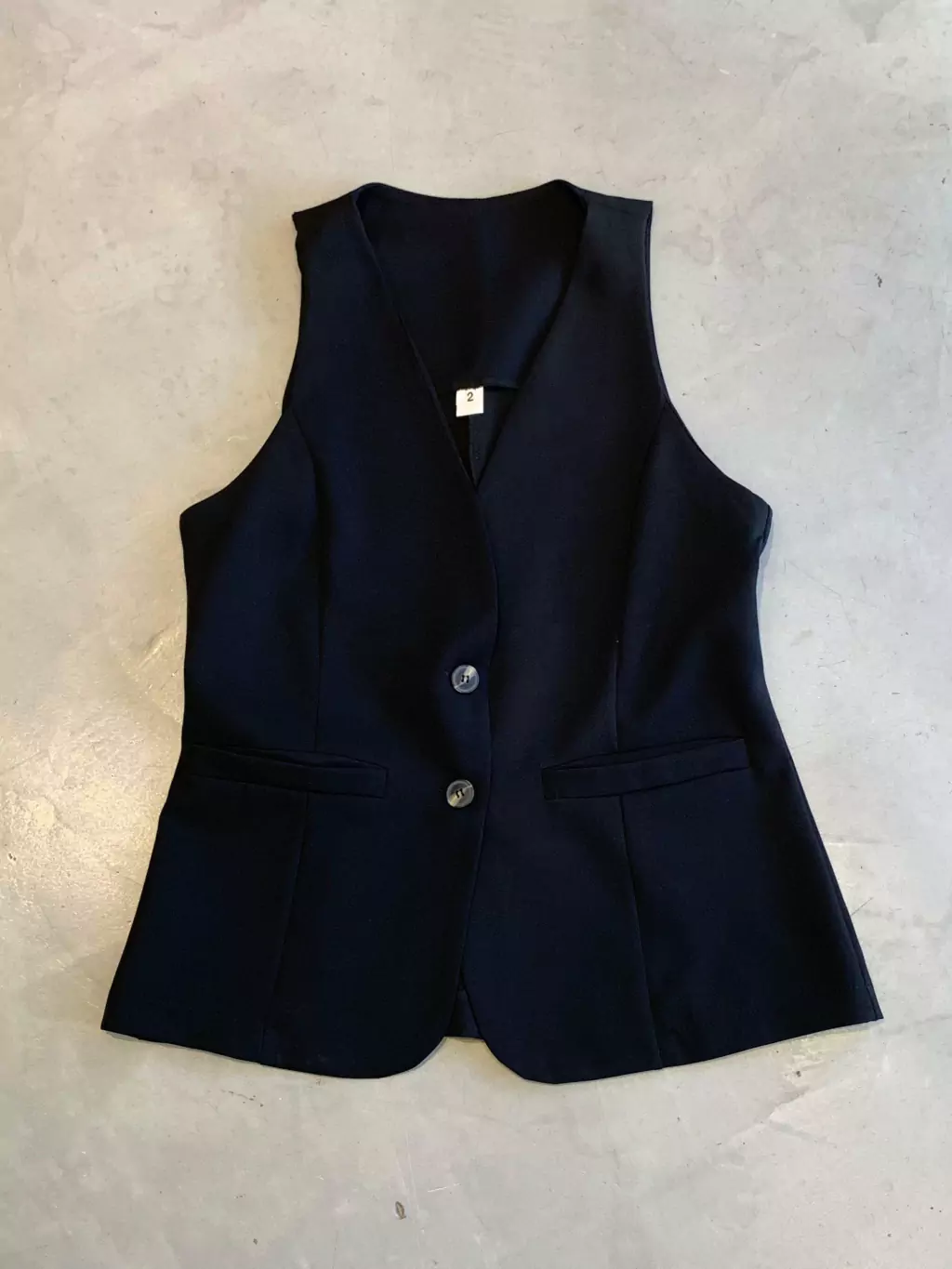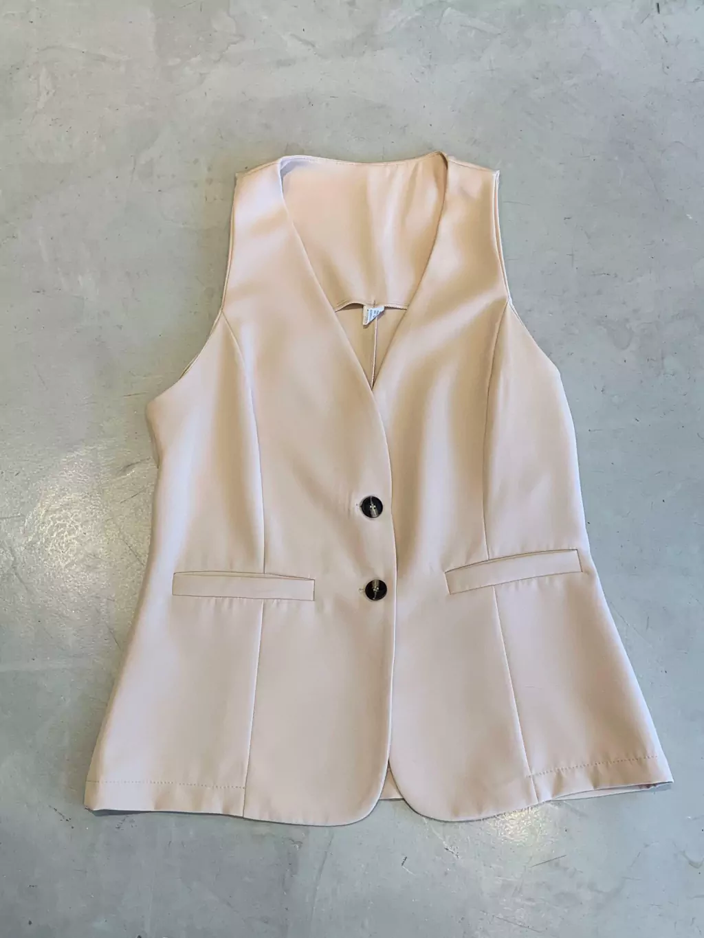 Tela satrera. Dos botones. Detalle falso bolsillo adelante. Tiene forro adentro. Entallado. Escote en V. Talle unico amplio.
