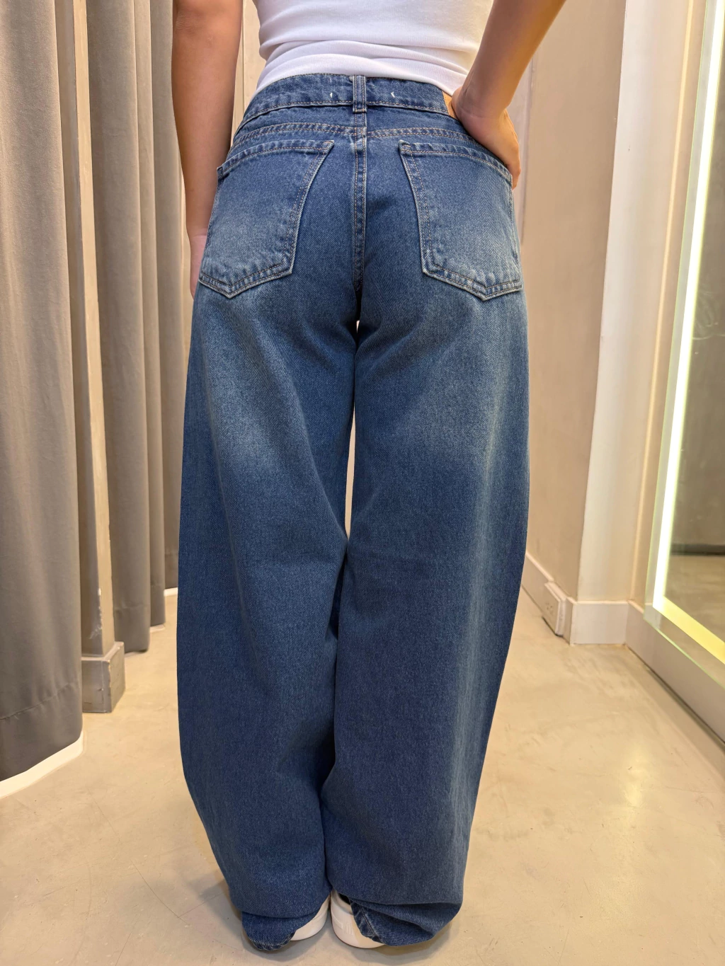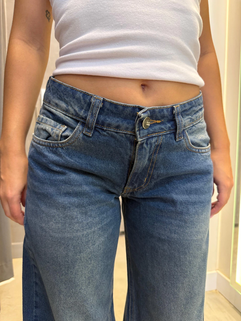 Wide leg. Tiro bajo. Azul gastado. La modelo en la foto usa talle 34.