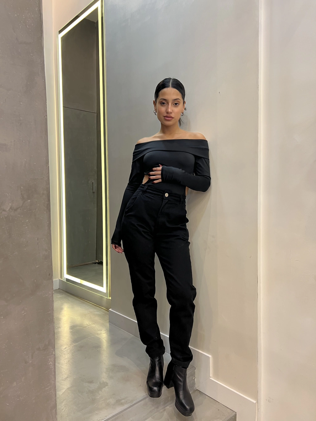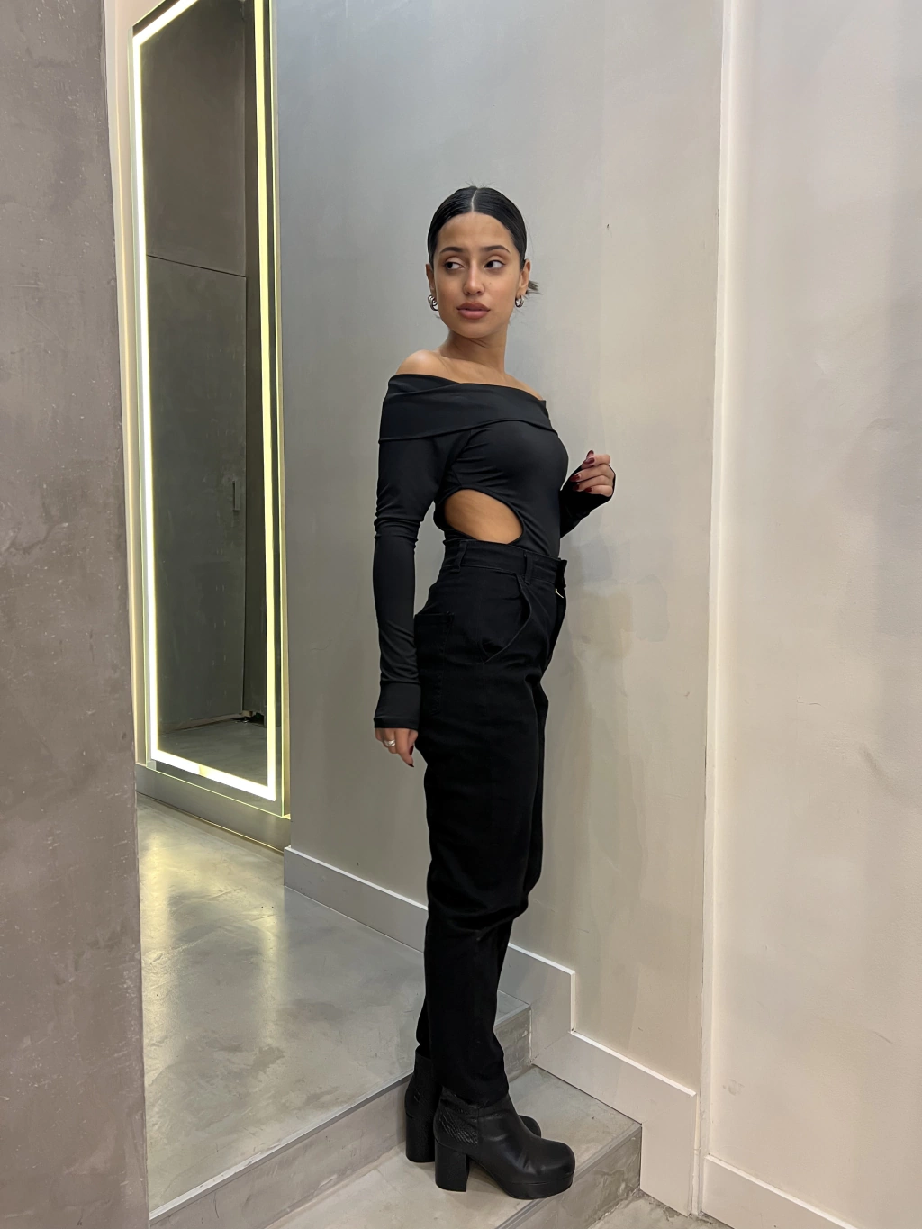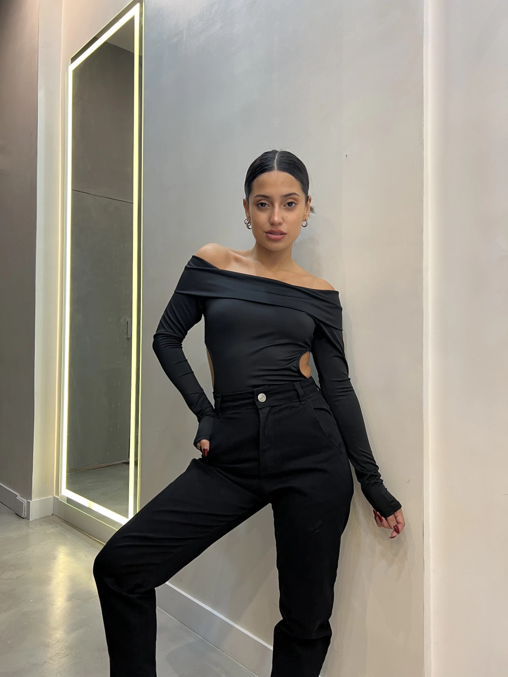 Tiro alto. Un poco elastizado. Corte slouchy recto. Talles