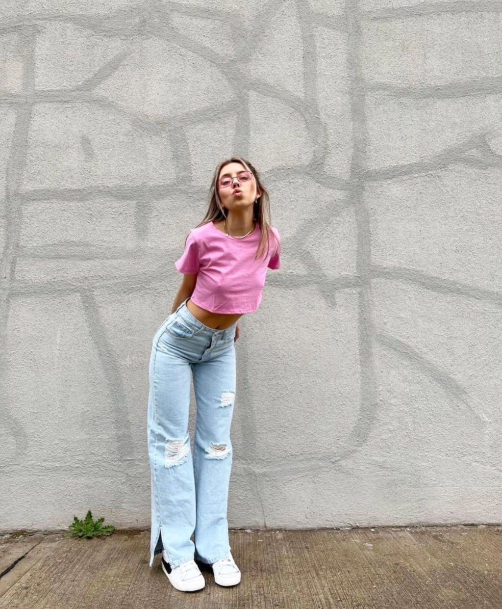 Jean rigido. Tiro alto. Roturas. Detalle tajo en pierna.