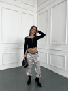 Tiro medio / bajo. Tela rígida. Detalle pinza recta adelante en rodilla. Suelto y amplio. Corto de pierna ya que es corte skater. Talles