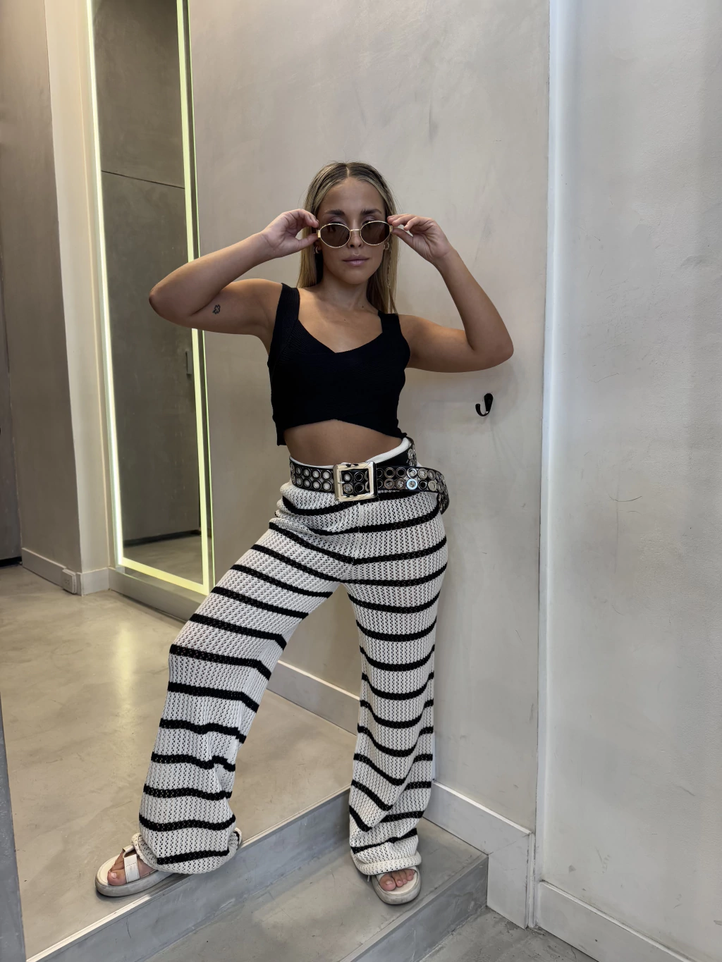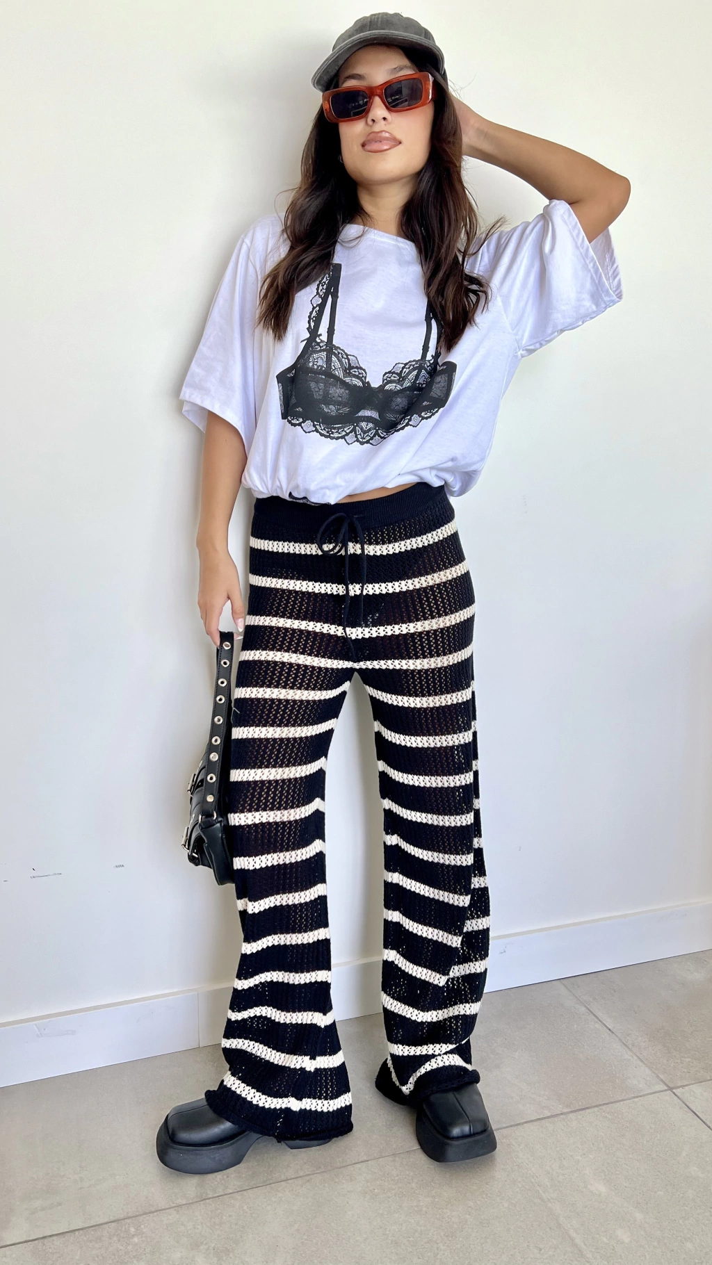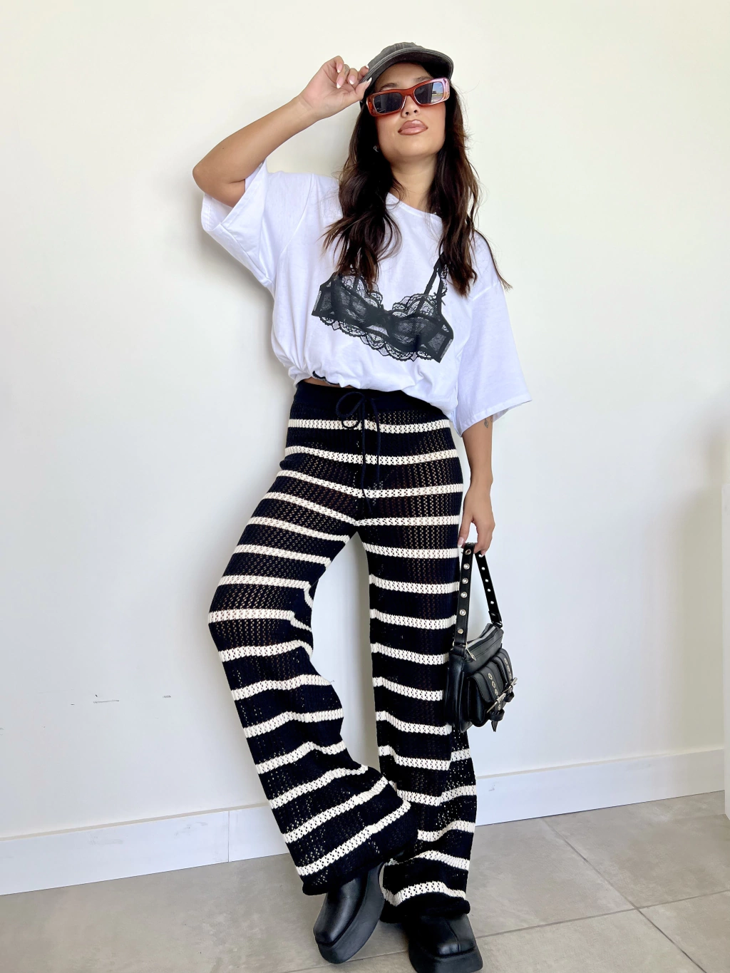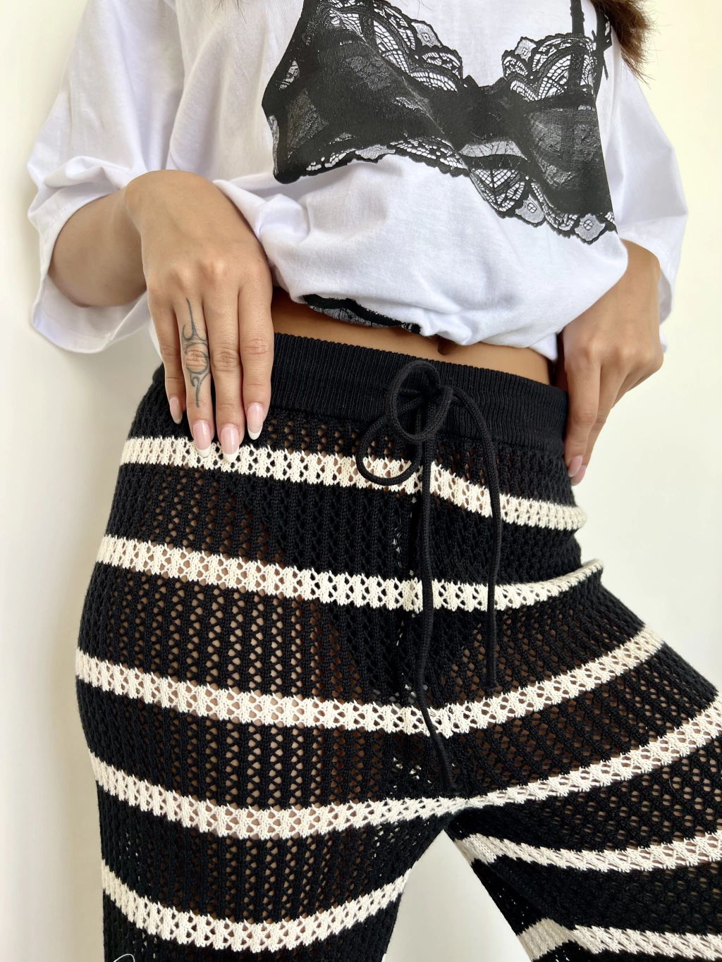 Tela hilo tejido. Rayado. Transparente. Cintura elástica para atar. Corte recto. Talle unico amplio (abarca desde un talle 36 a un 42)