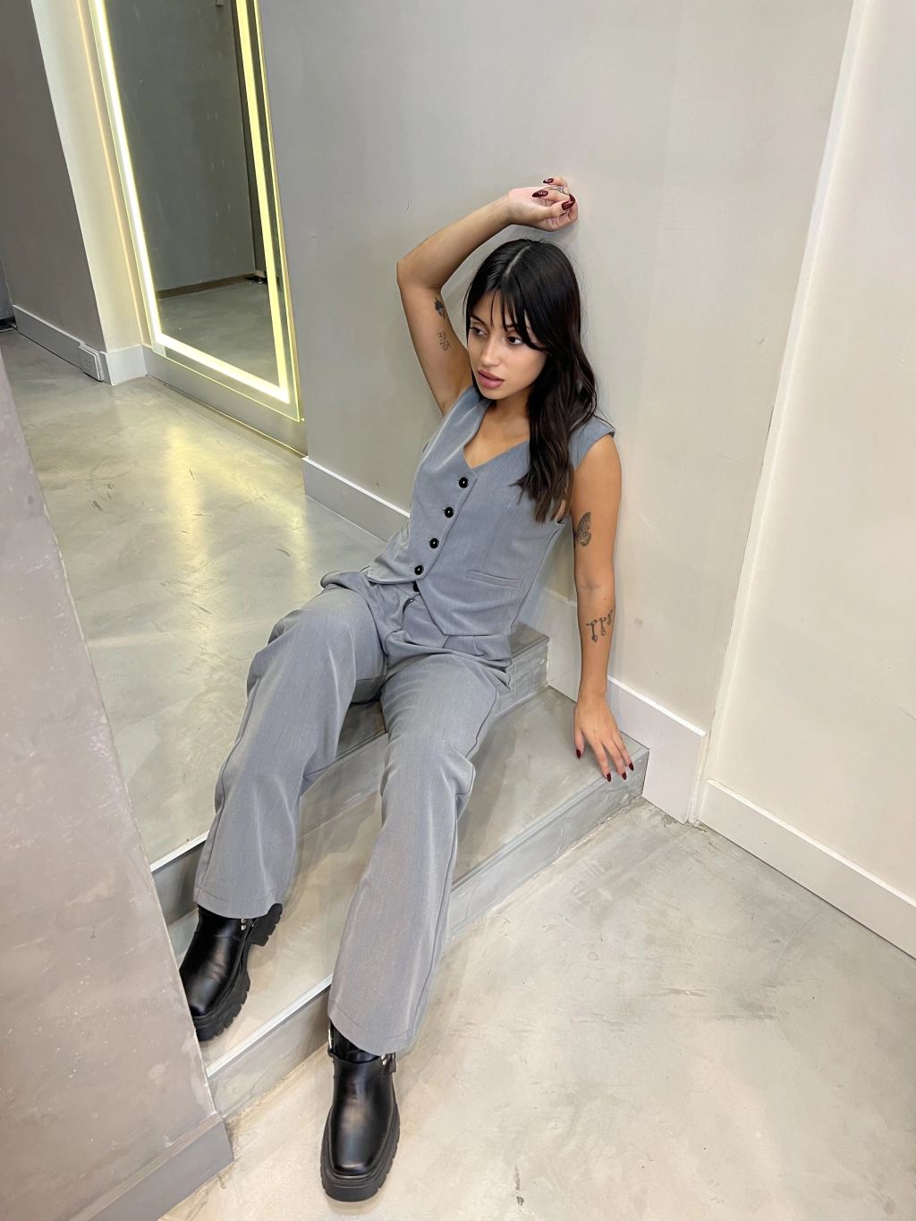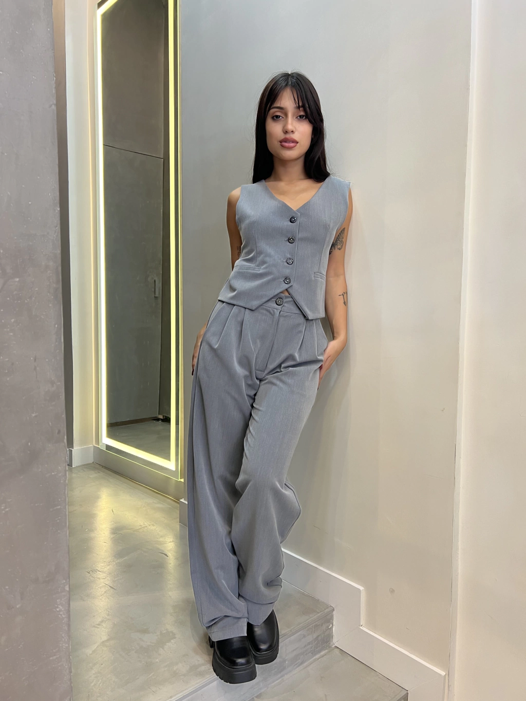 Tela sastrera. Tiro alto. Pinzado. Bolsillos. Corte recto. Talles