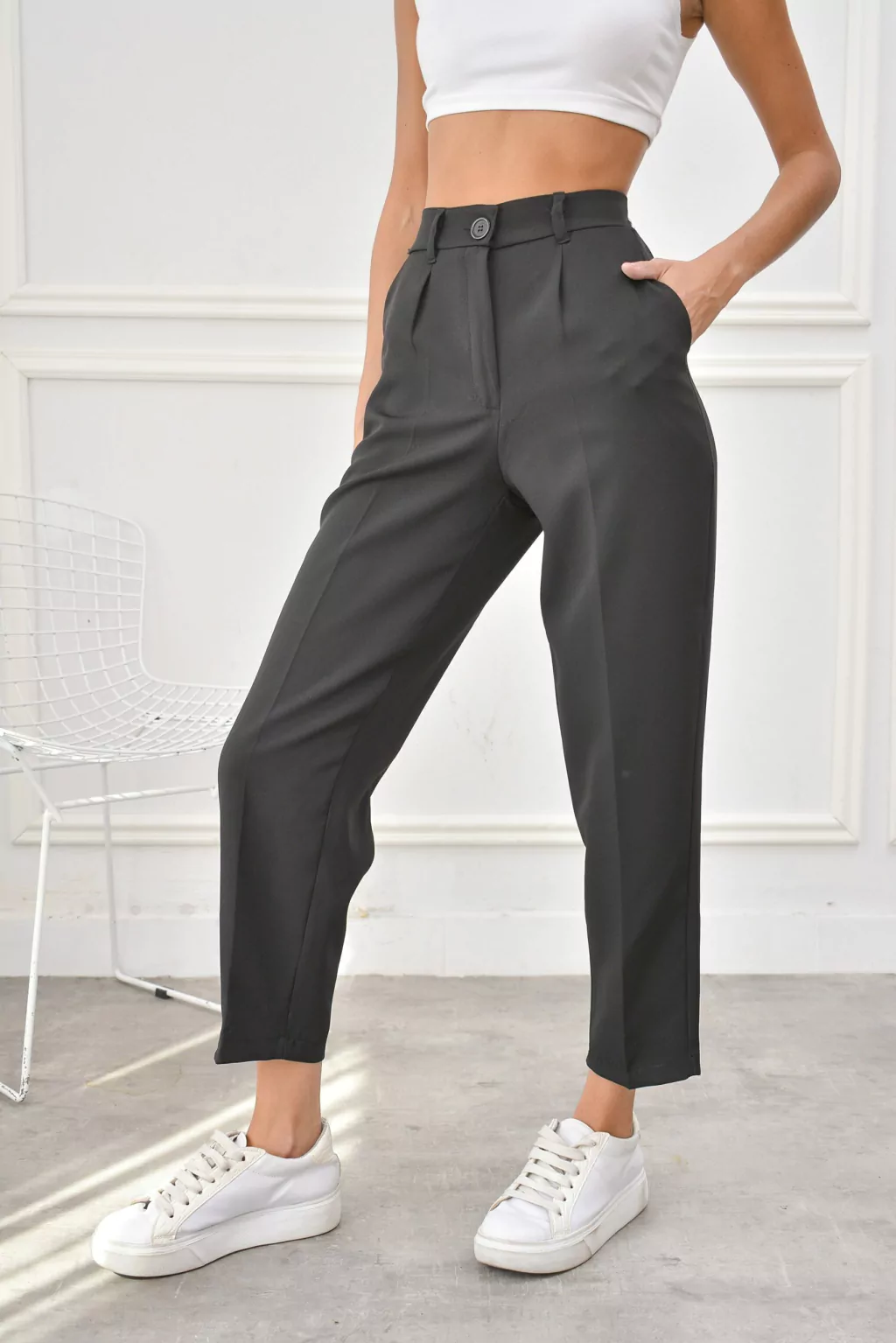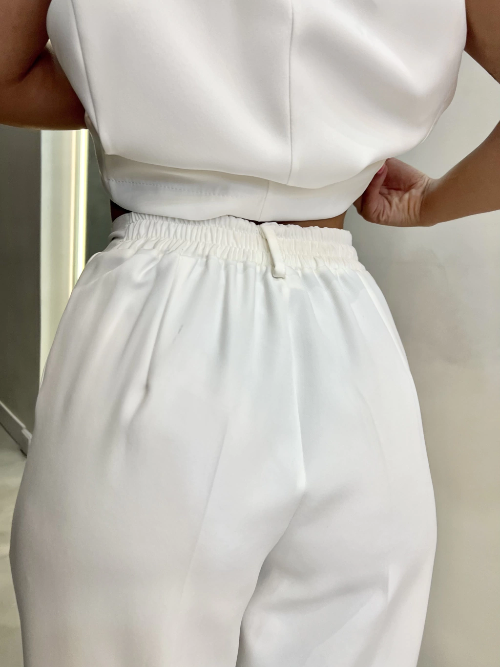 Tela sastrera. Cintura elástica. Boton. Bolsillos. Corte mom. Talles. La modelo usa en la foto talle 1 (equivale a un talle 36/38)