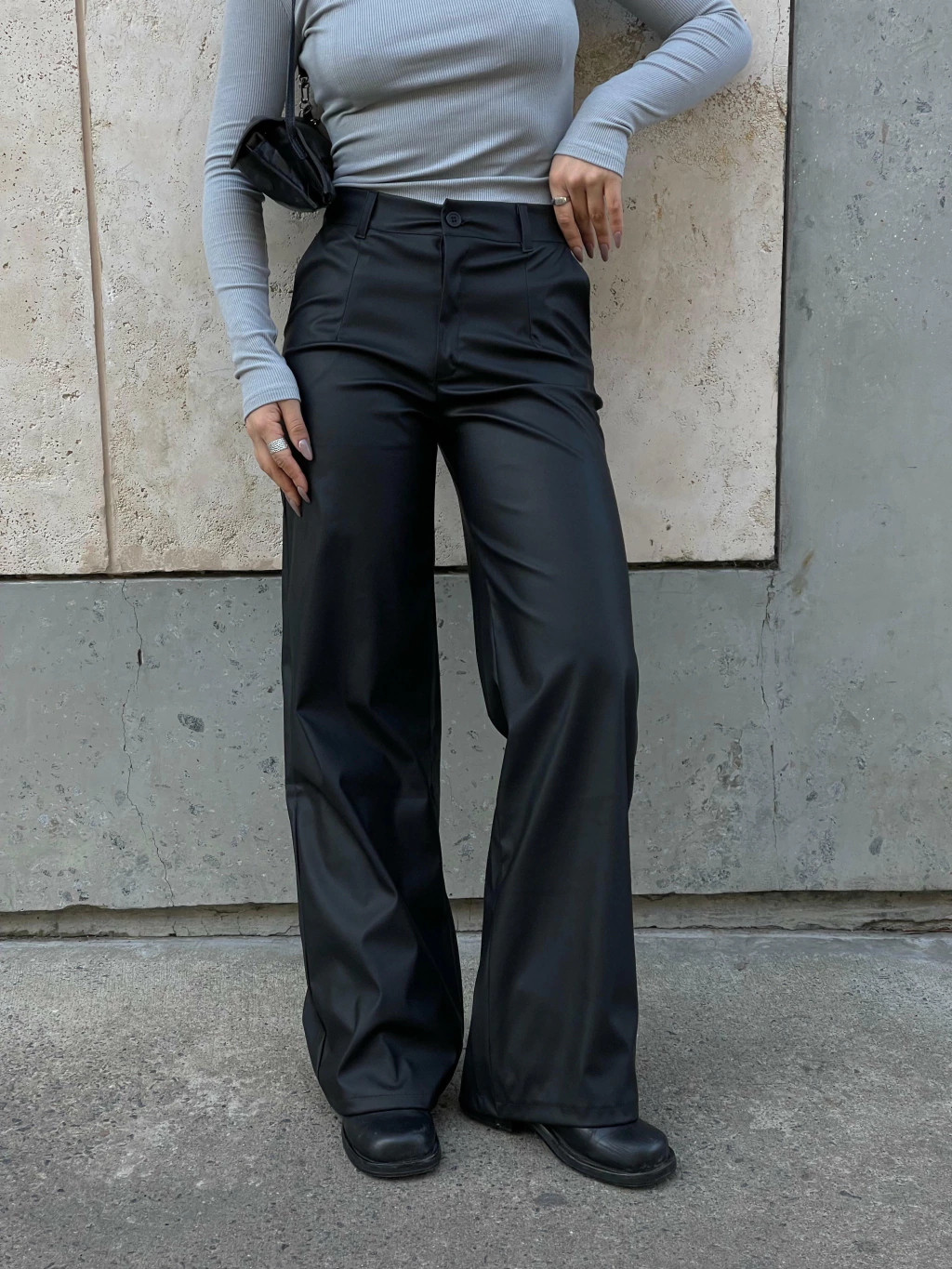 Tiro alto. Tela cuerina . Corte recto wide leg. Cierre y botón. Pinzas adelante. Bolsillo lateral. Talles. La modelo en la foto usa talle S.