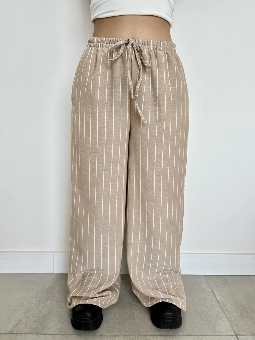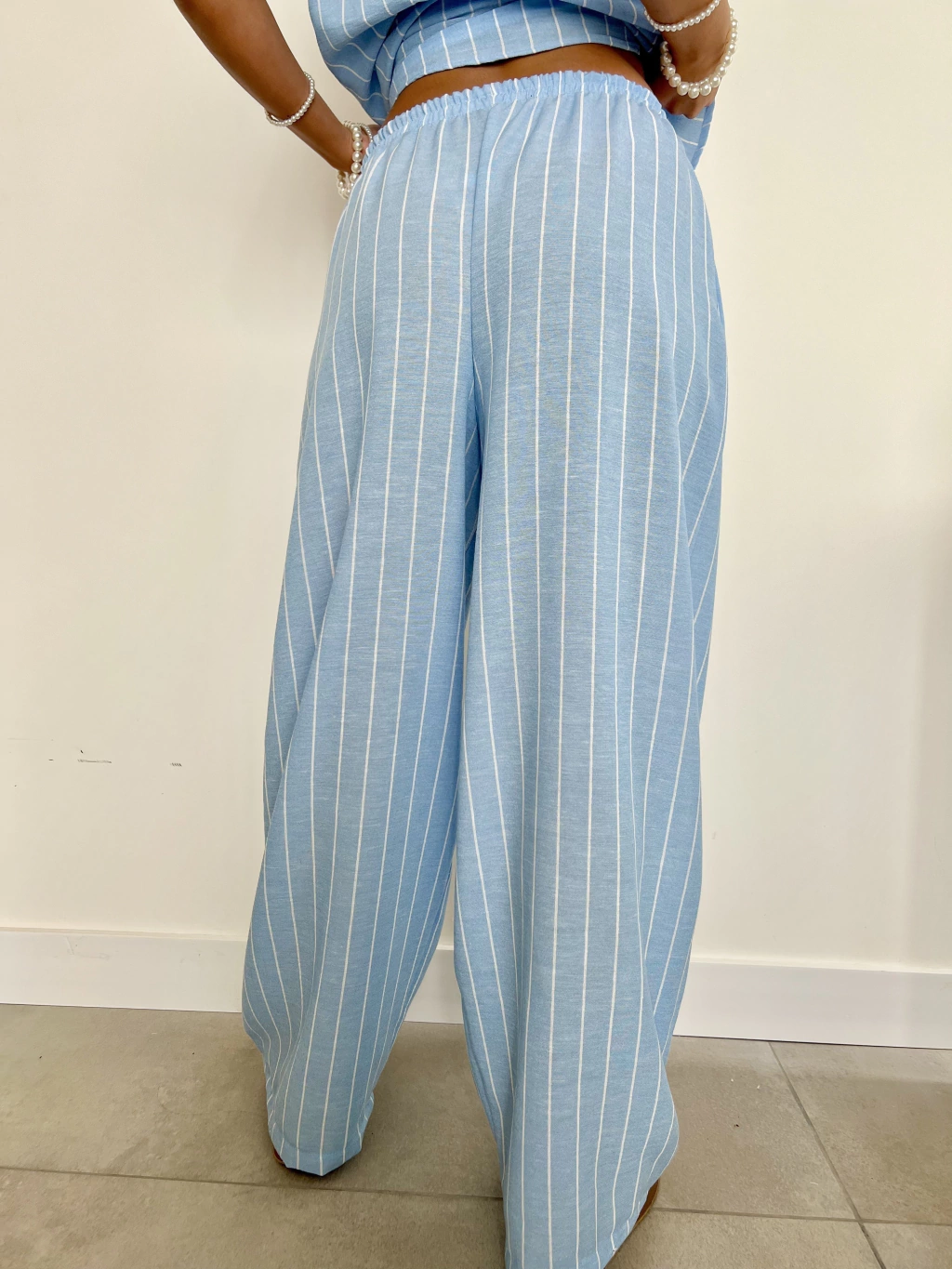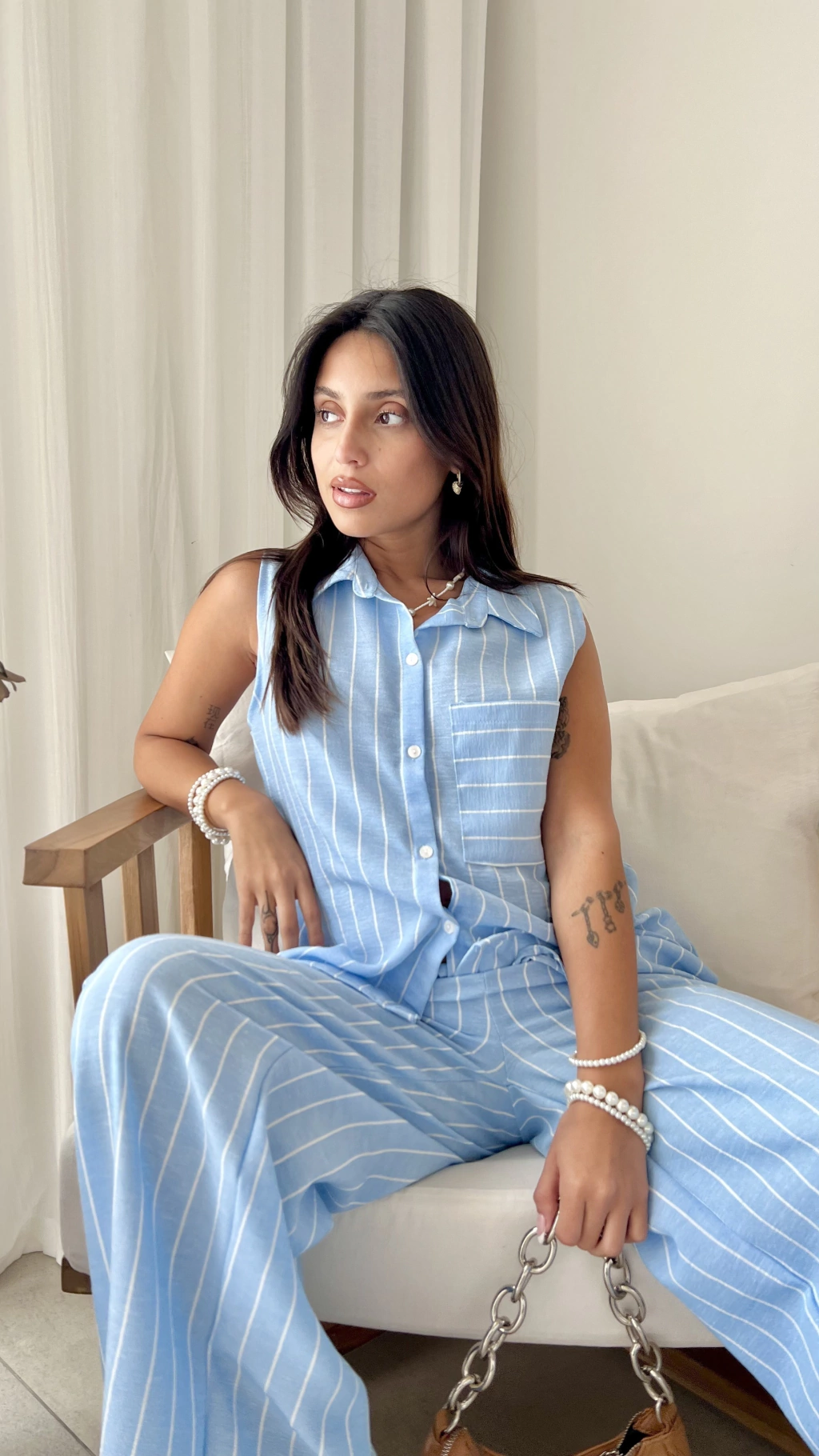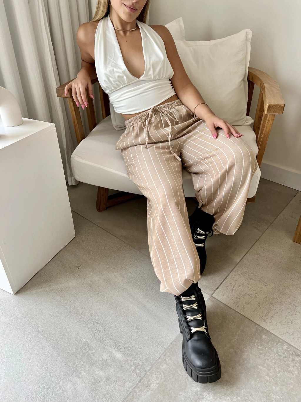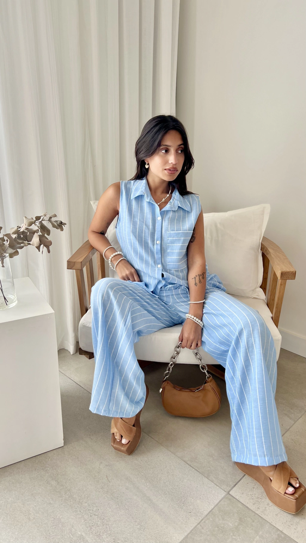 Tela lino. Rayas blancas. Lazo sin botón. No tiene bolsillos atras. Corte recto. Talle unico amplio (abarca hasta un talle 40)