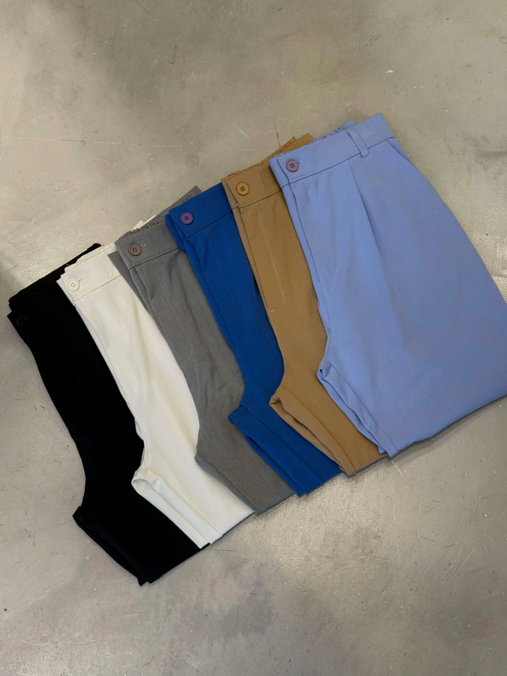 Tiro alto. Tela sastrera. Modelo corto de largo de piernas (a los tobillos)