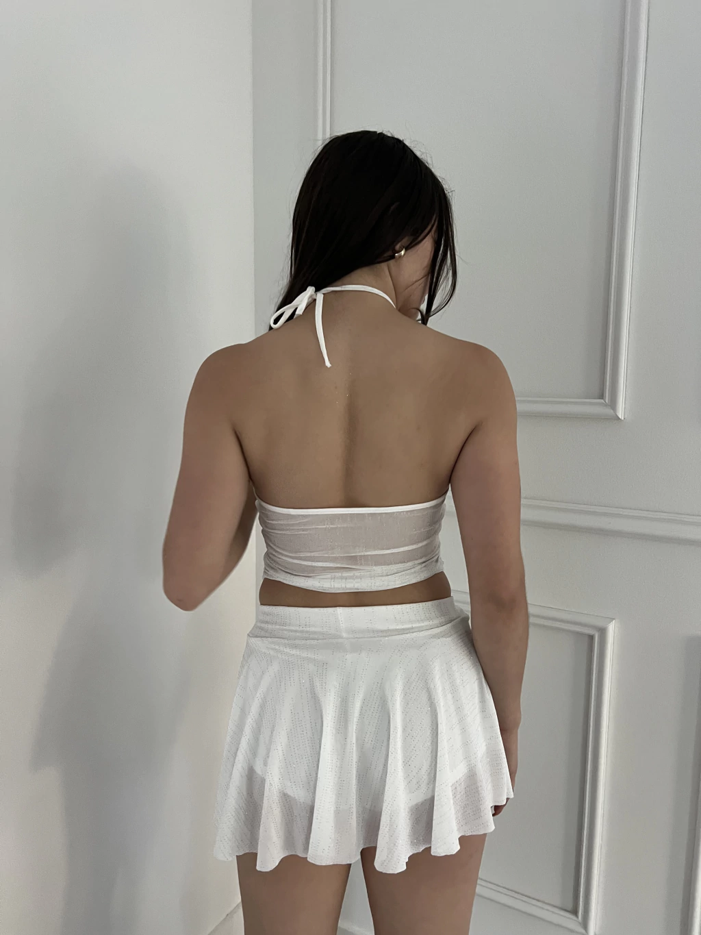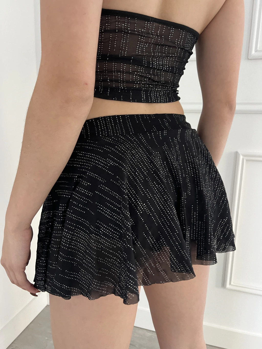 Tela tul con brillo. Tiene short debajo. Cintura elástica. Sueltita. Talle unico amplio (abarca hasta un talle 40 amplio)