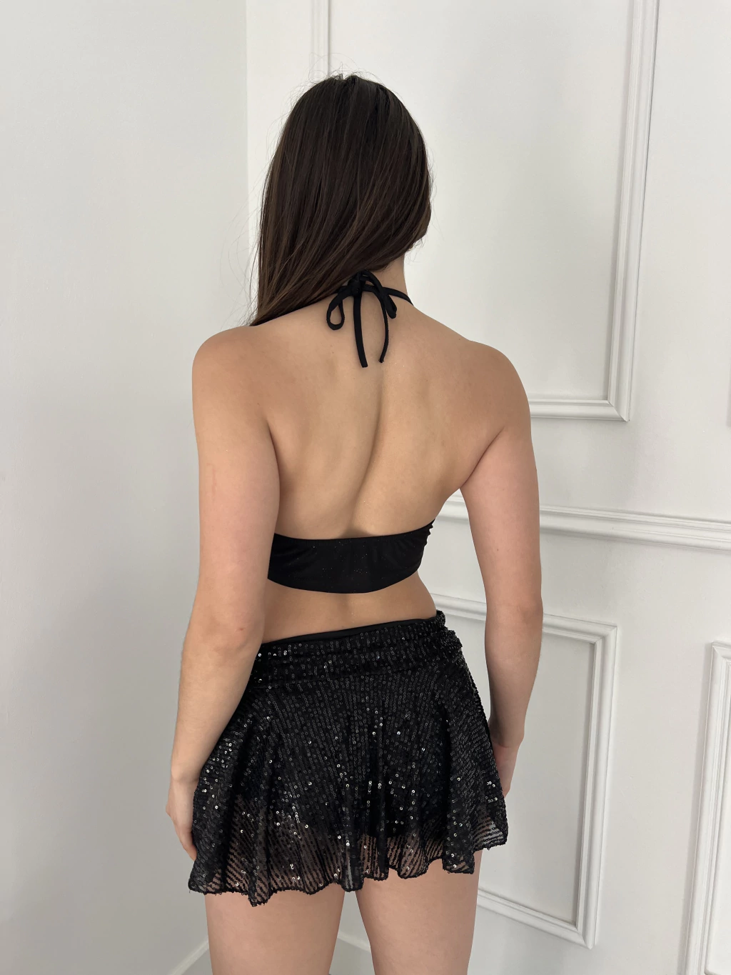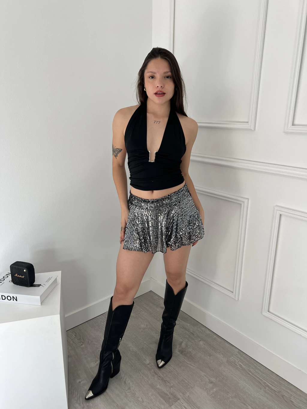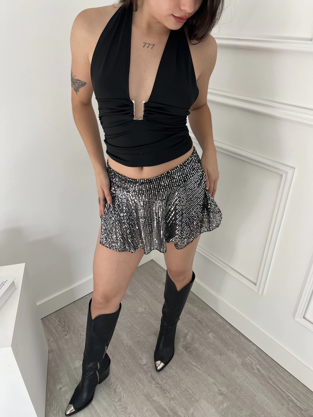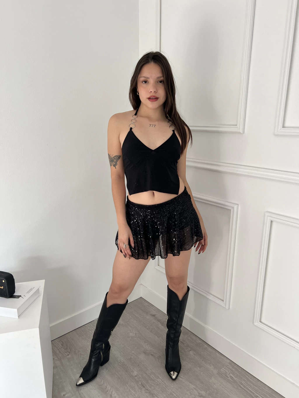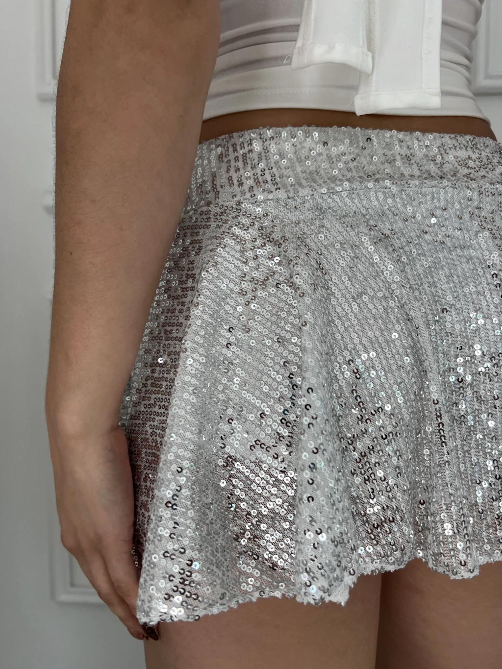 Tela lentejuelas. Volados. Cintura elástica. Tiene short debajo de lycra. Talle UNICO amplio (abarca hasta un Talle 40 amplio)