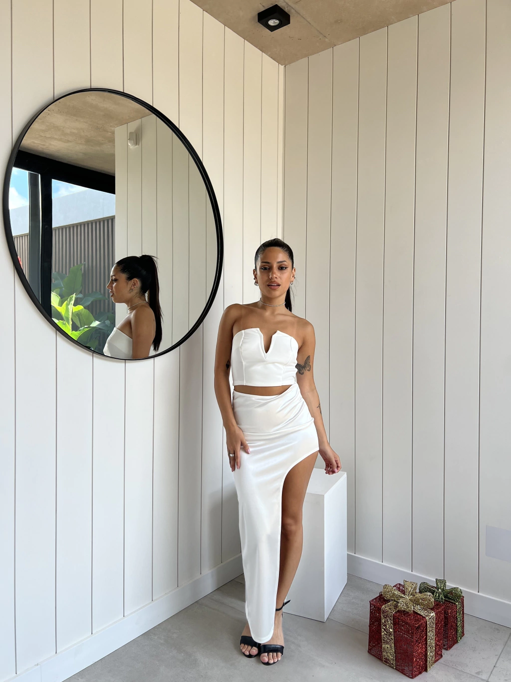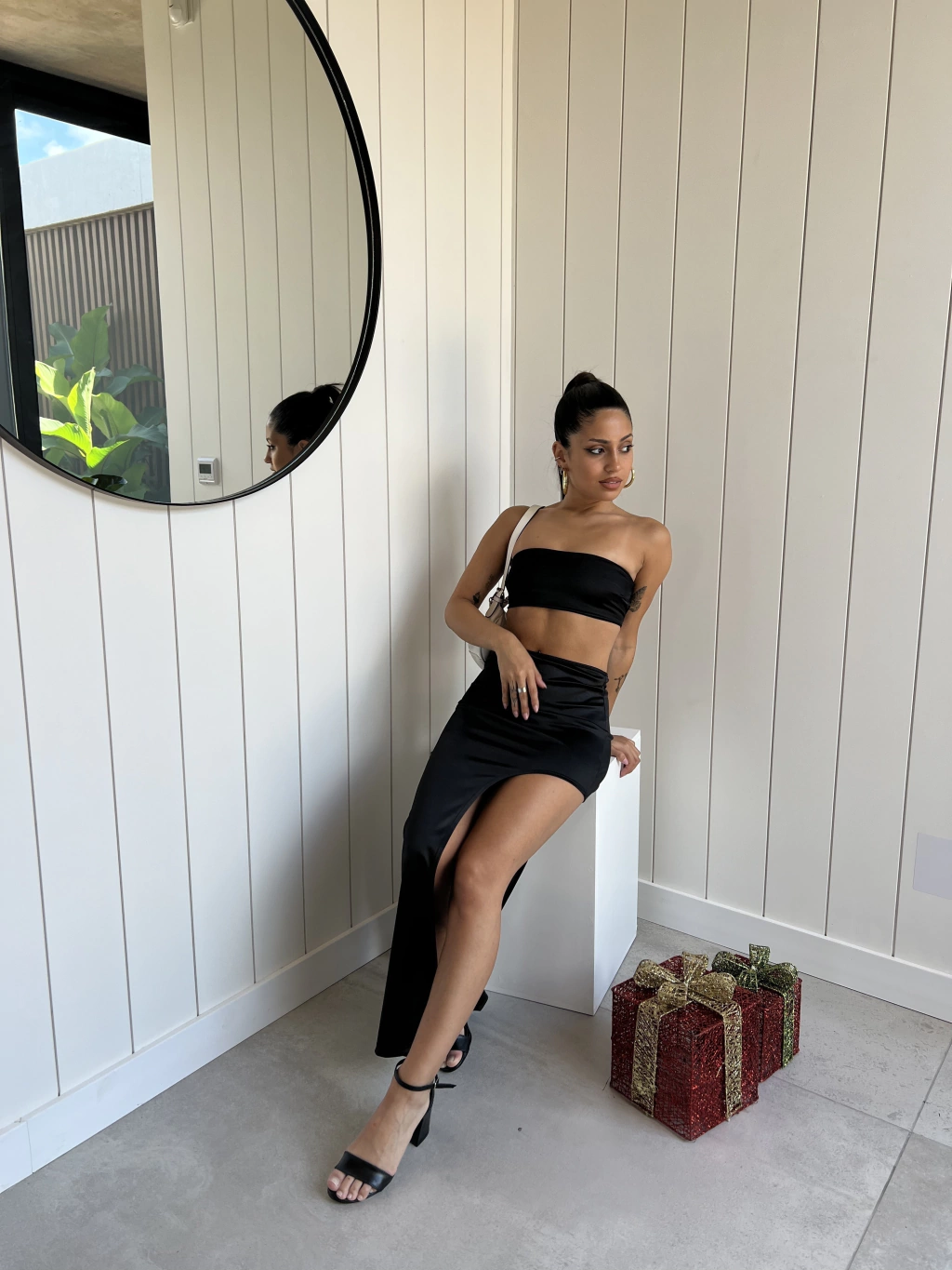 Tela saten. Tiro alto. Detalle tajo. Talle unico (abarca hasta un talle 40)