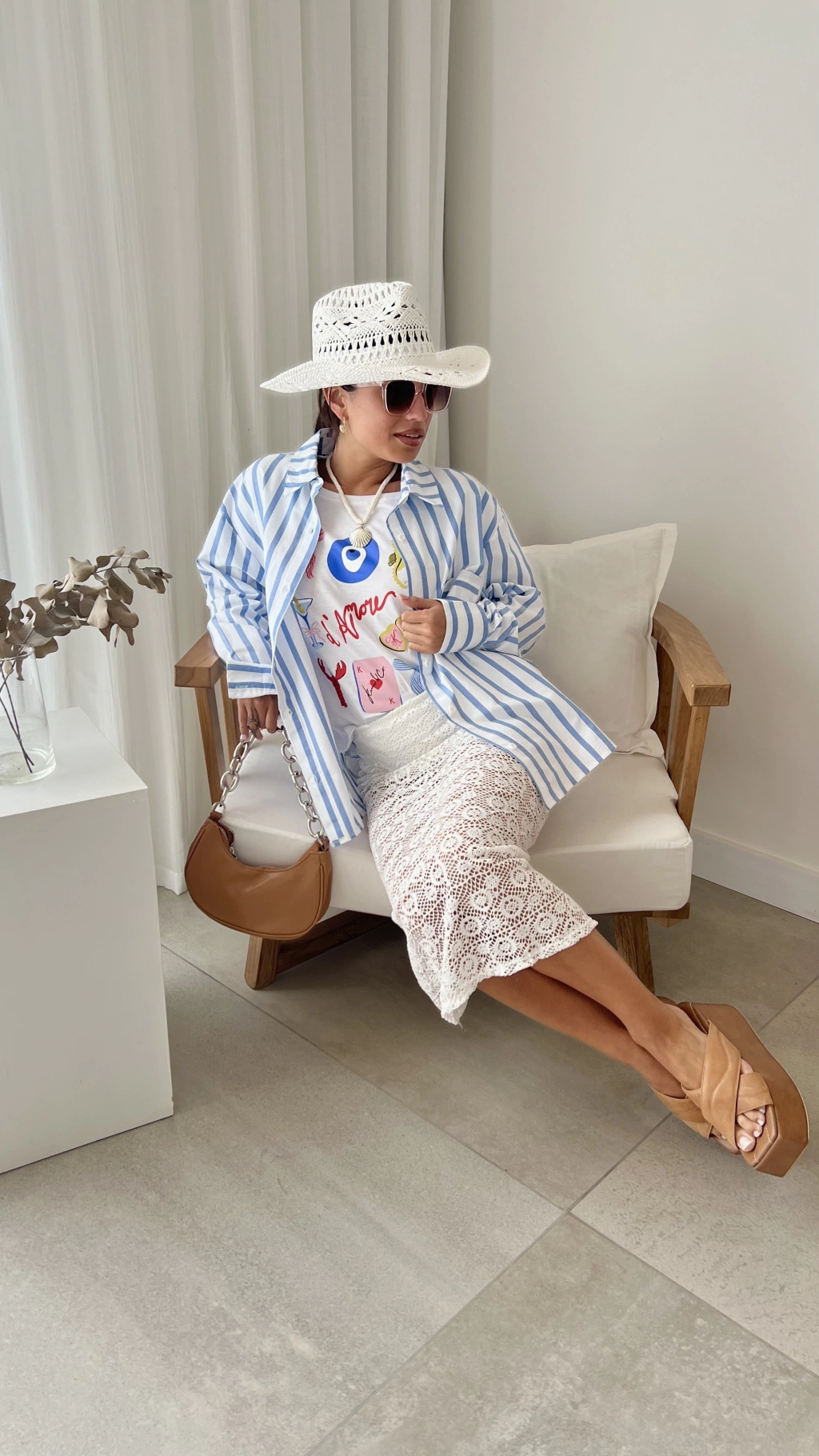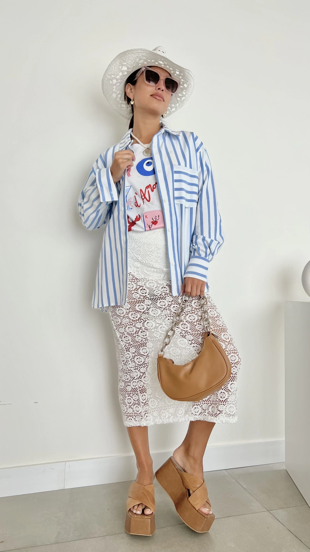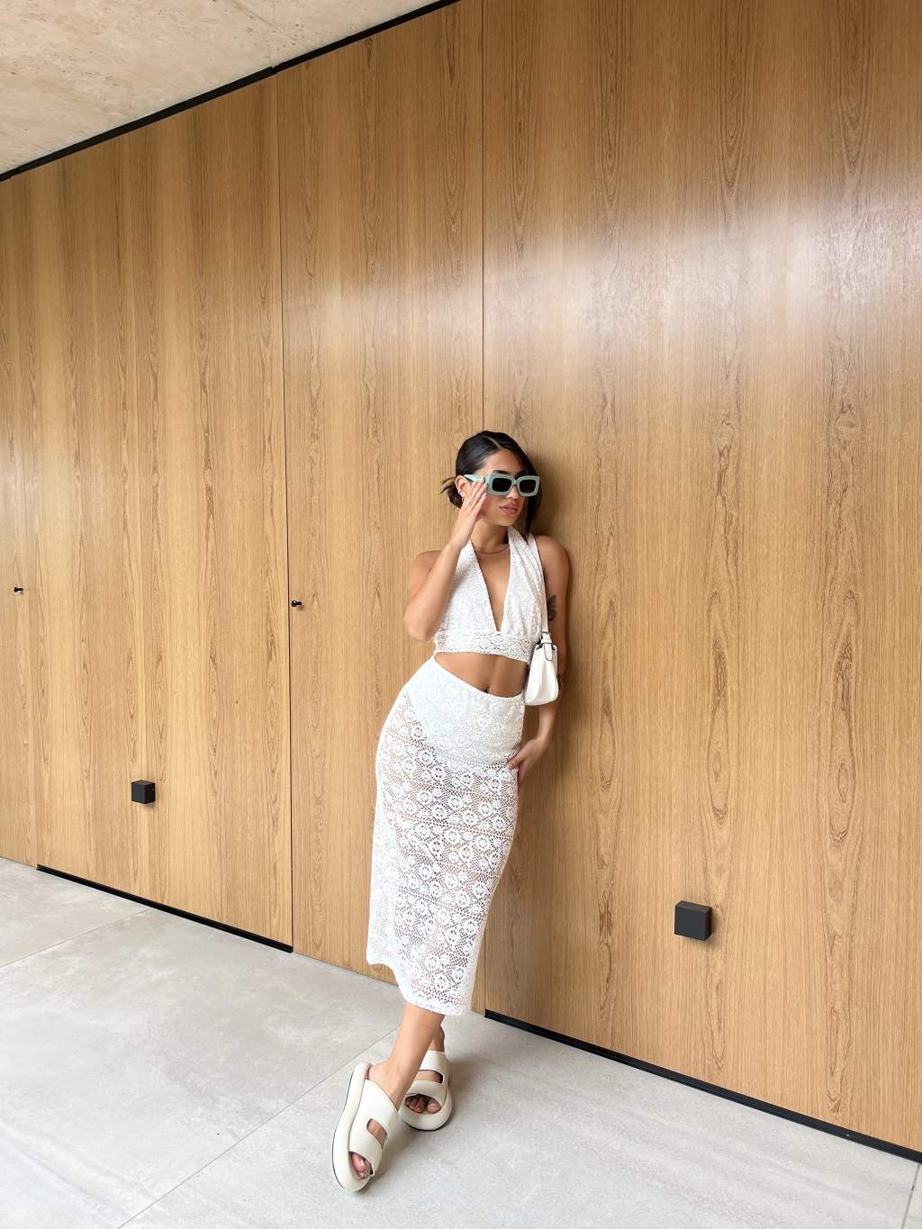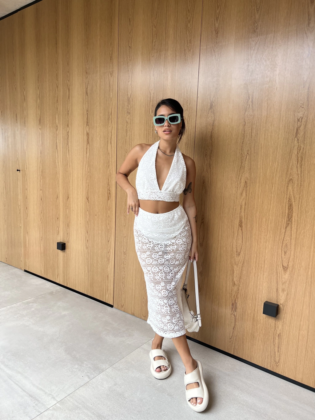 Tela calada. Tiro alto. Talle unico (abarca hasta un talle 40). Incluye bombacha blanca.