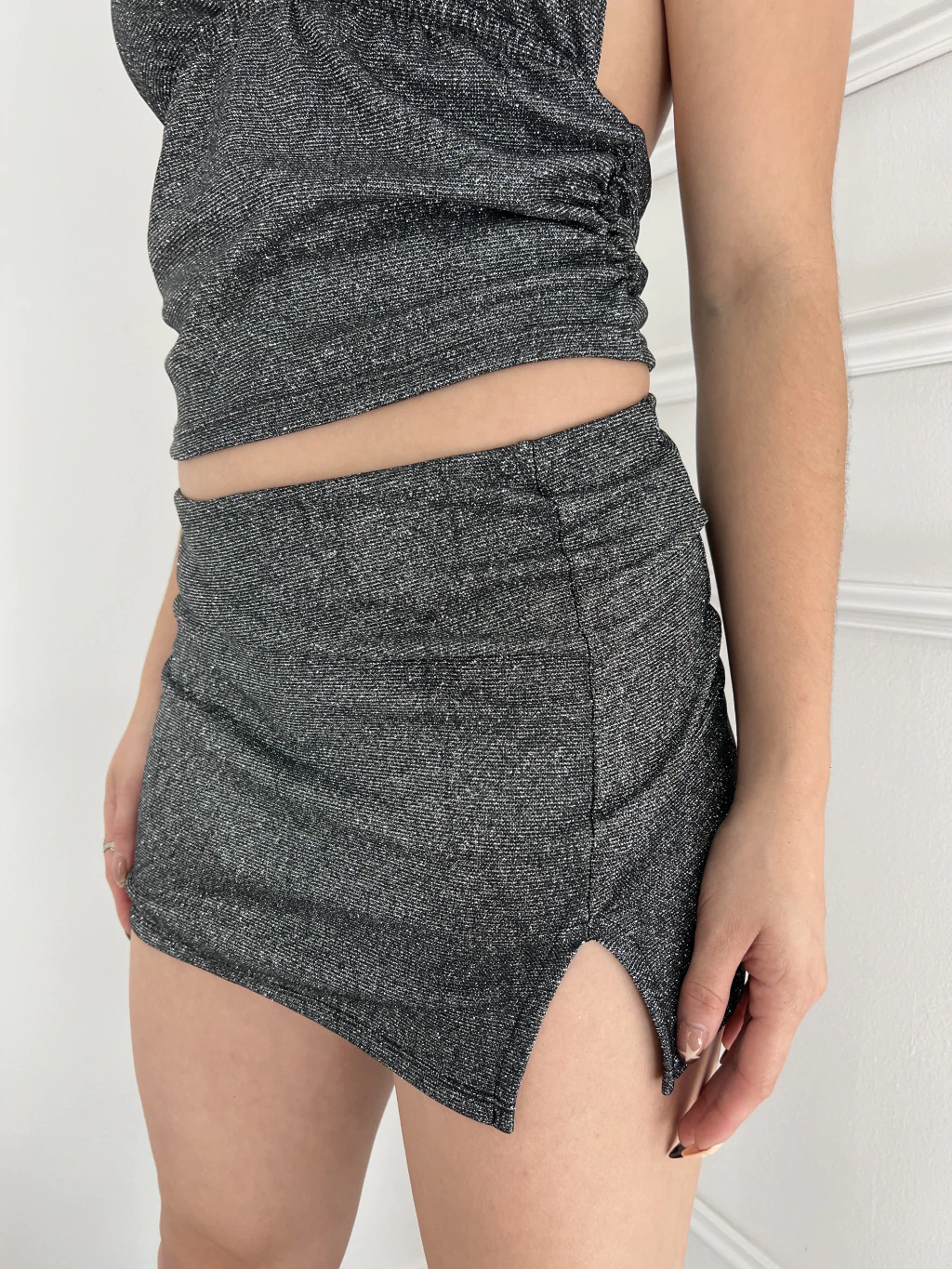 Tiro medio/ bajo. Tela glitter brillo. Tajo. Al cuerpo. Talle unico (abarca hasta un talle 40 amplio)