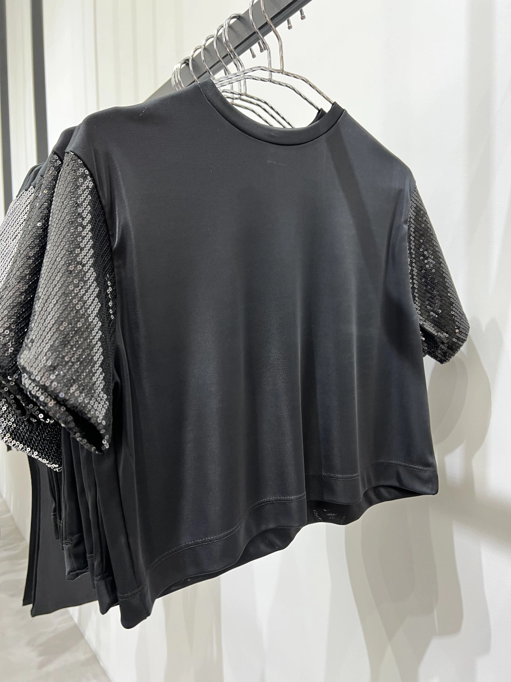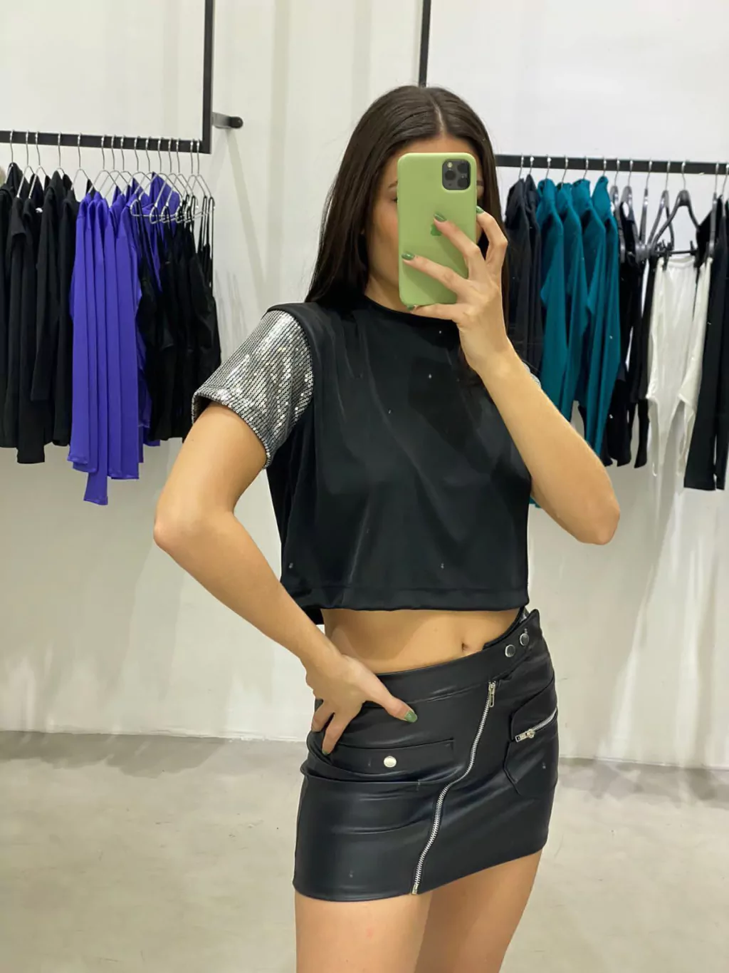 Detalle manga corta de lentejuelas. Modelo corto a la cintura. Talle unico amplio (abarca hasta un talle M amplio)