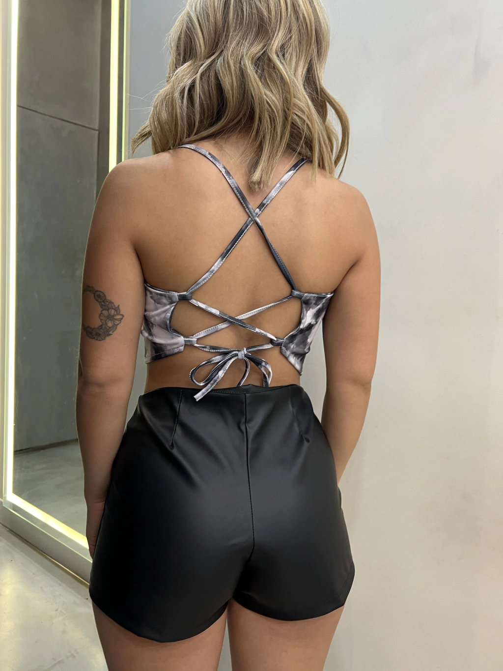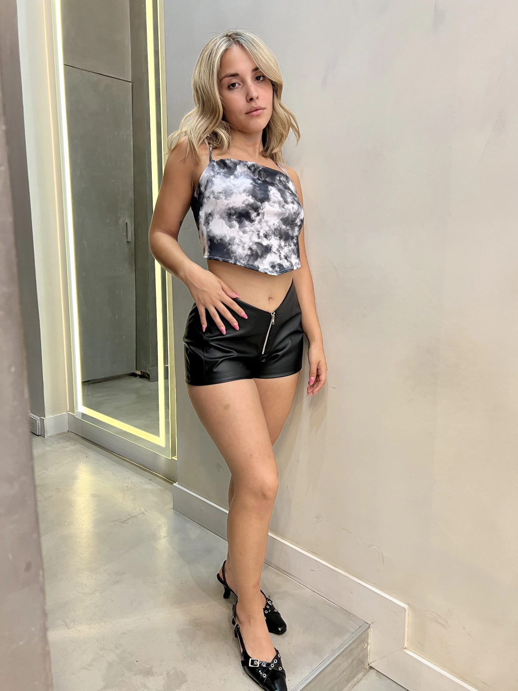 Tel cuerina. Cierre adelante. Tiro bajo en V. Al cuerpo. Talles. La modelo en la foto usa talle S