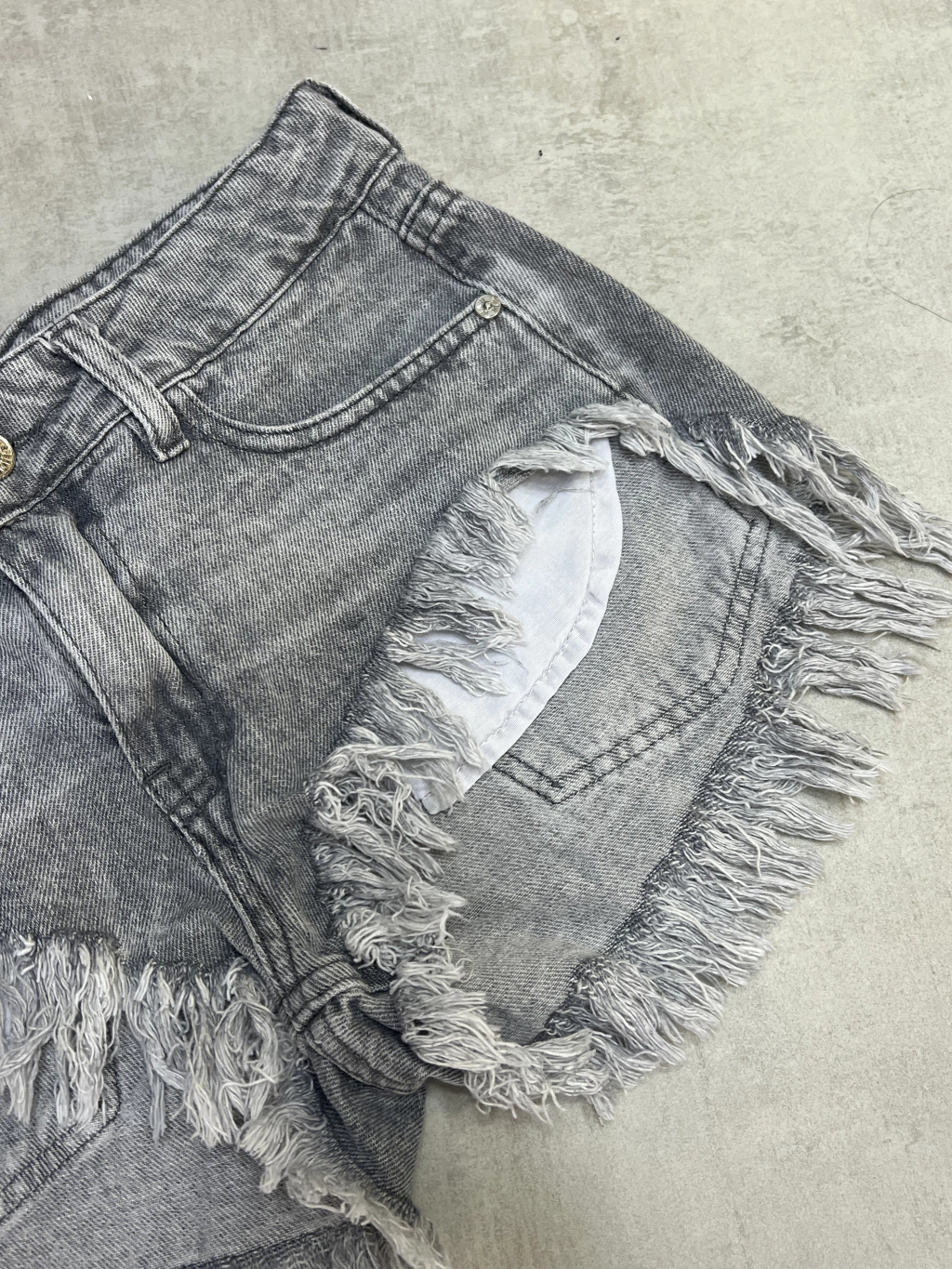 Tiro bajo. Desflecado. Rígido. Bolsillos adelante que se ven. Gris gastado. Talles.