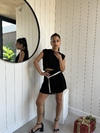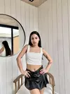 Tela cuerina. Tiro bajo. Detalle para pasar cinto. Al cuerpo. La modelo usa talle S