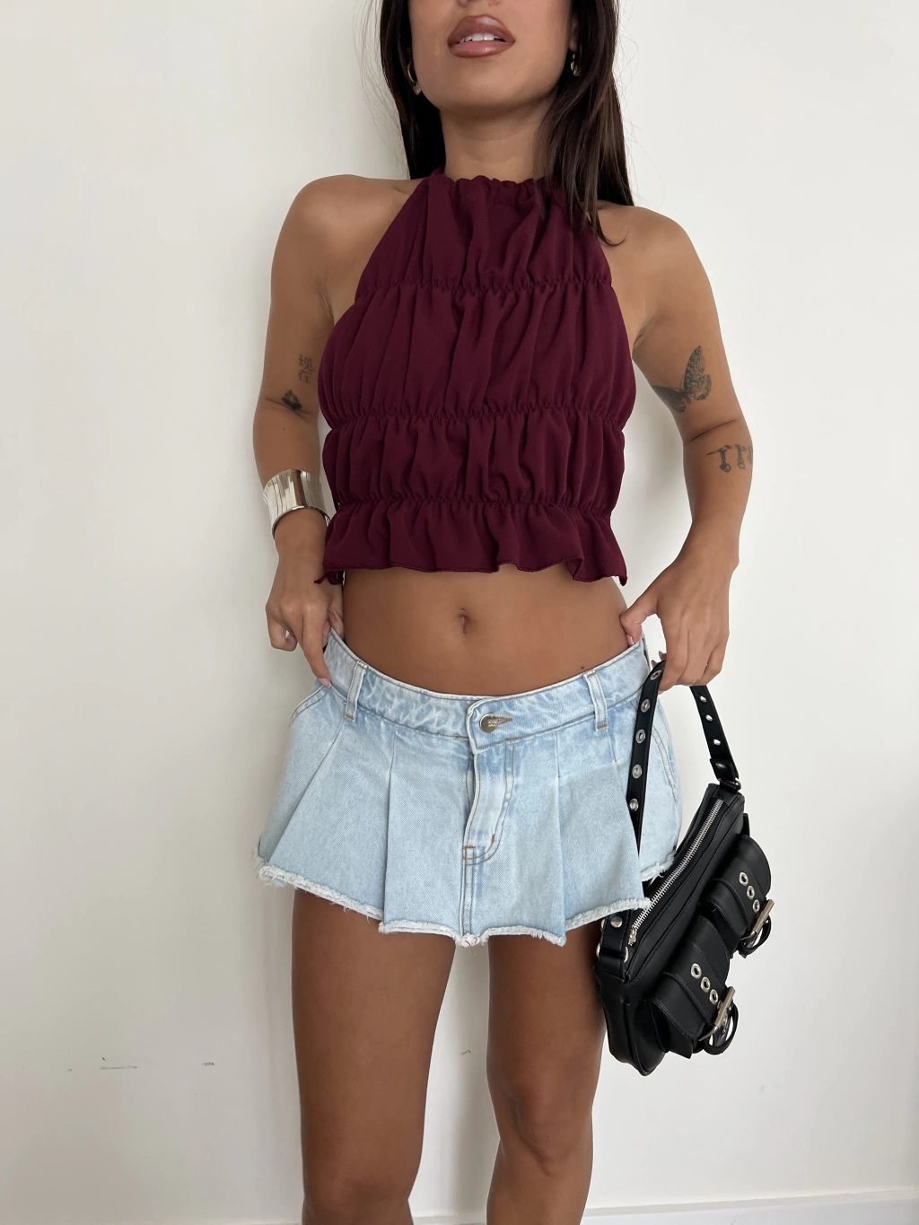 Tela jean rigido. Tiro bajo. Skort (pollera adelante y short atras) . La modelo usa un talle 36.