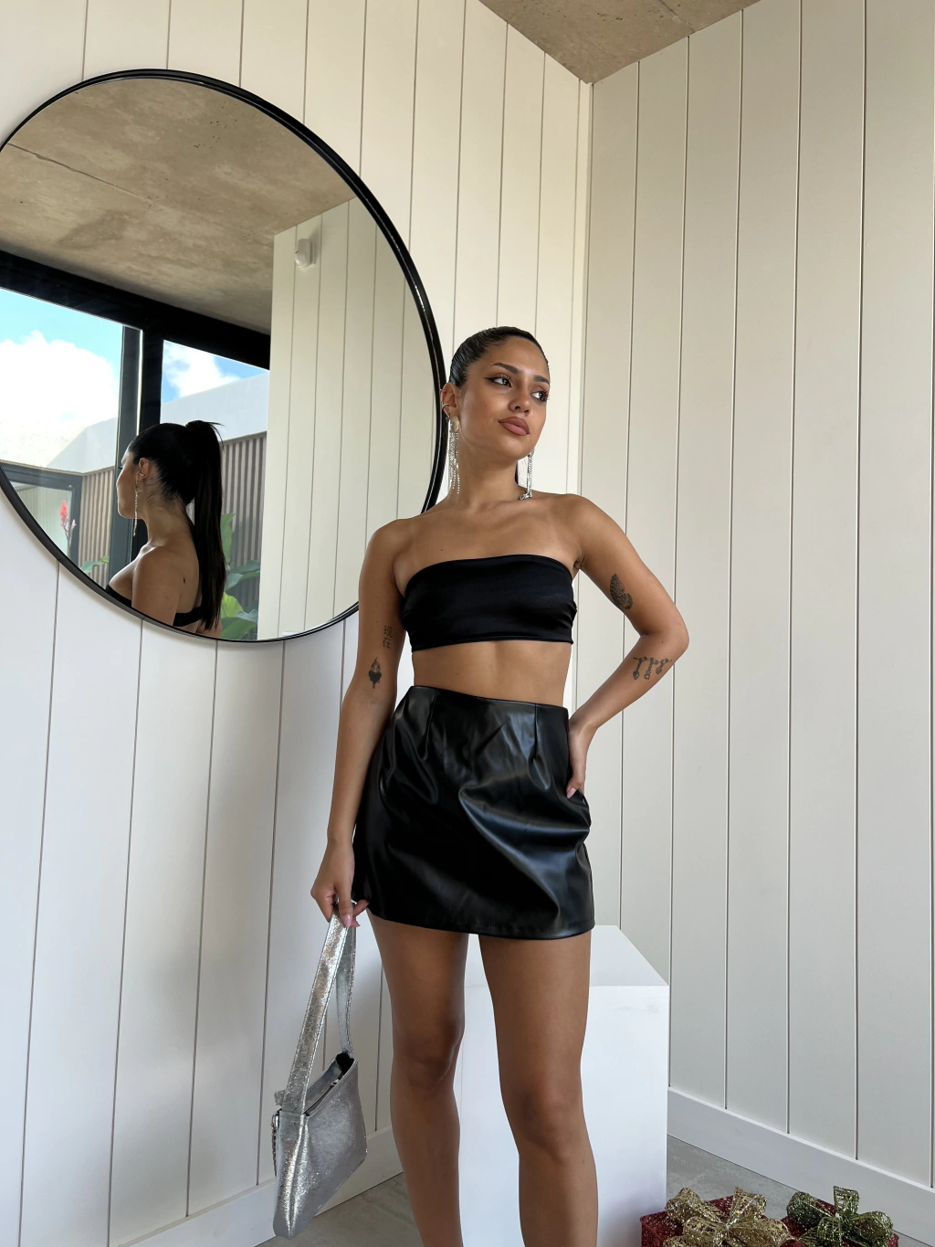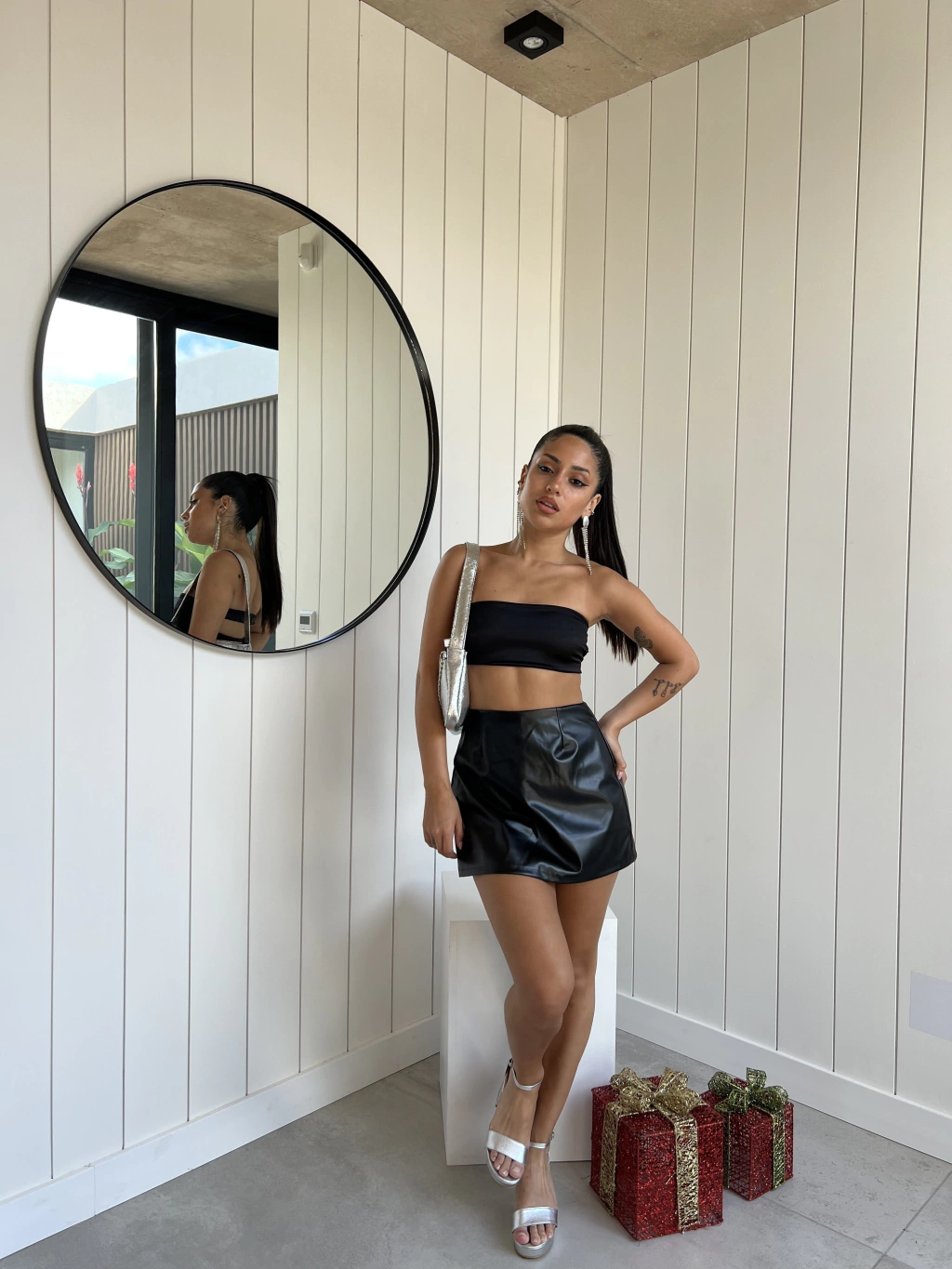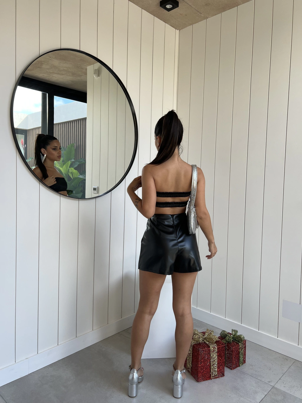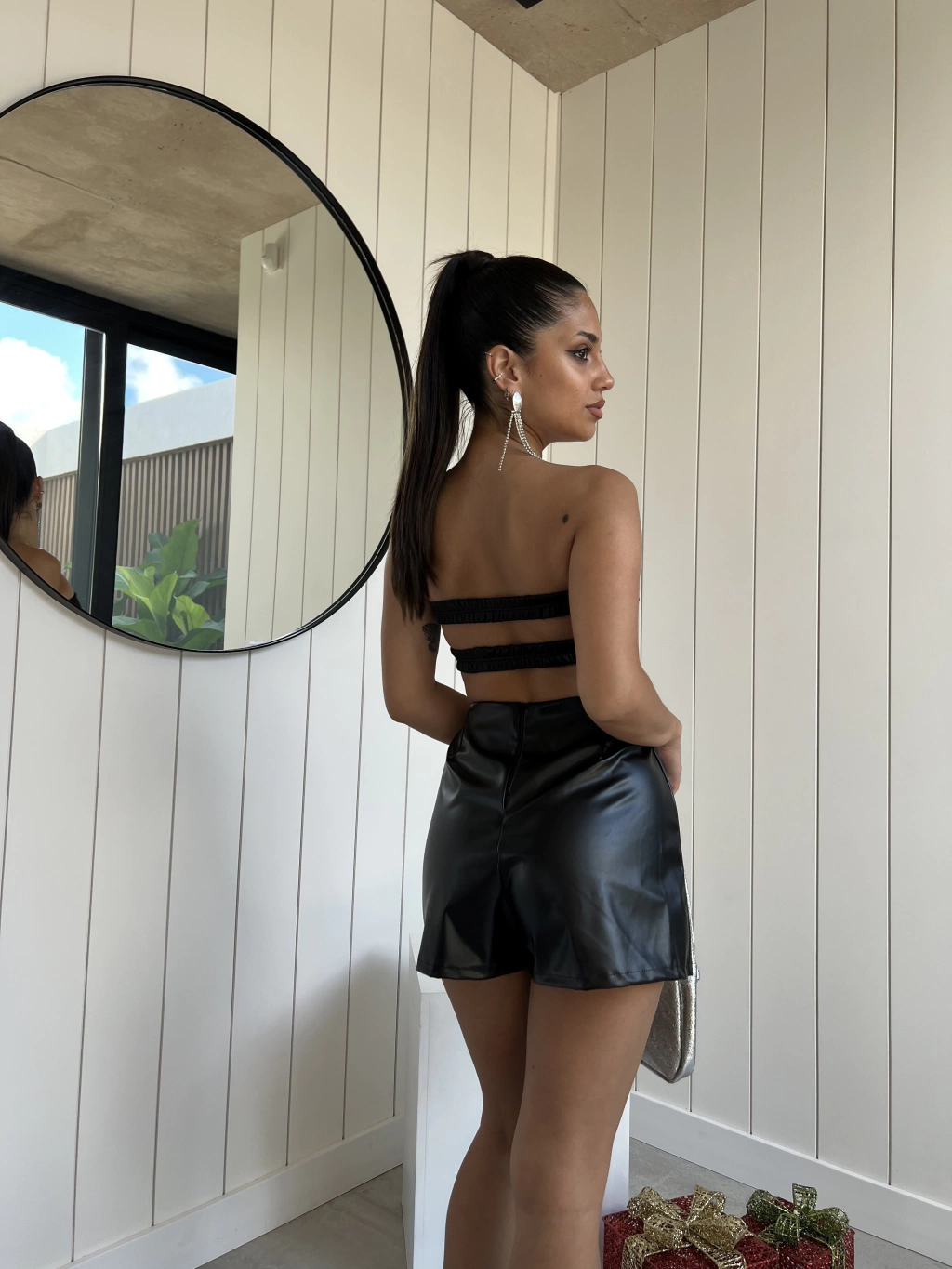 Tela cuerina. Color negro. Short atras / pollera adelante. Tiro alto.
