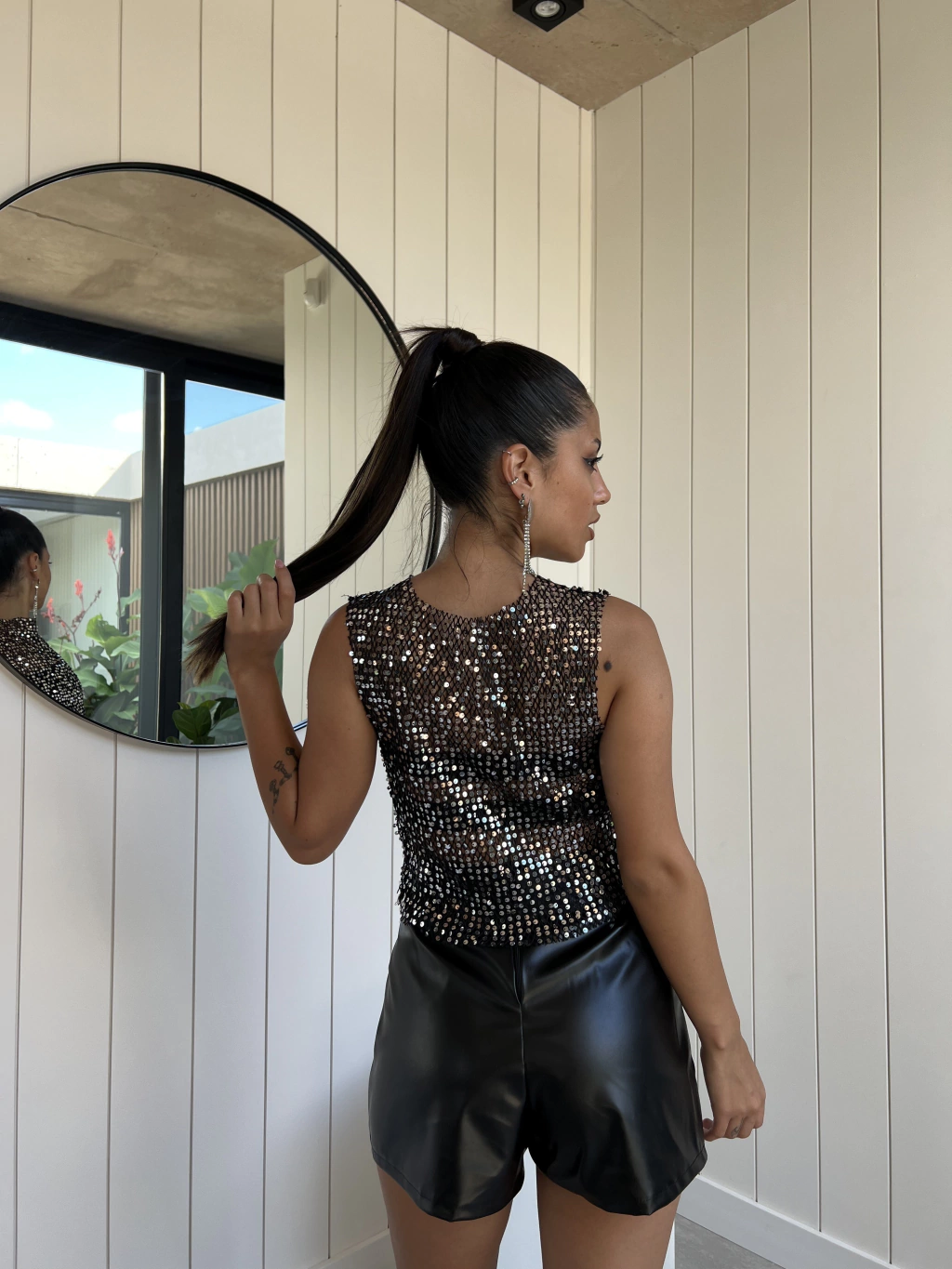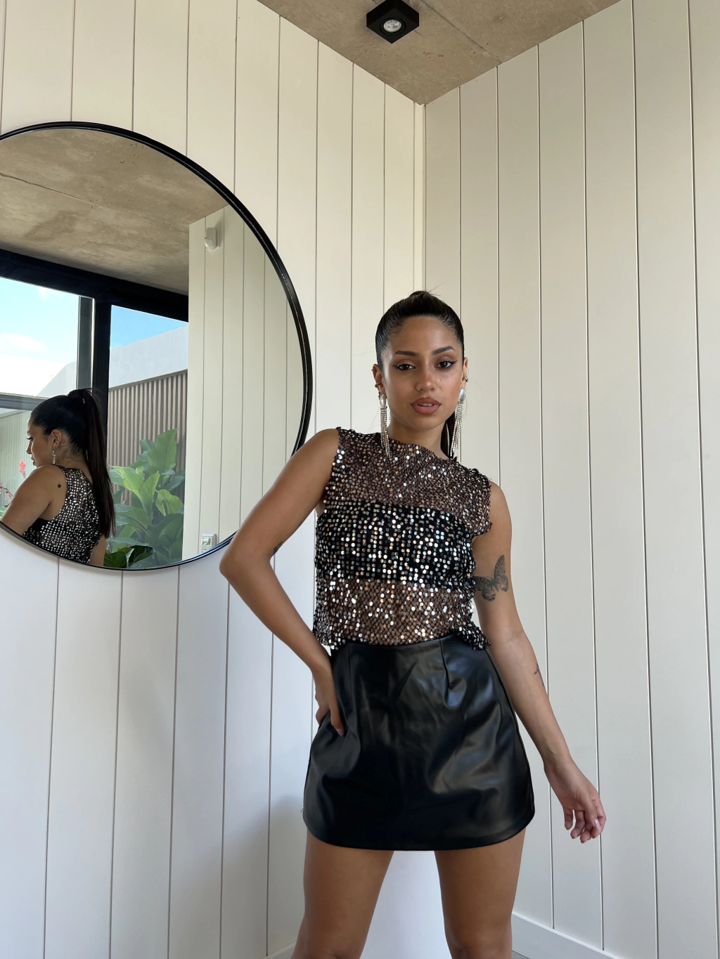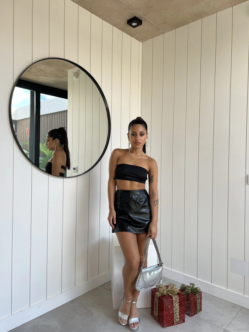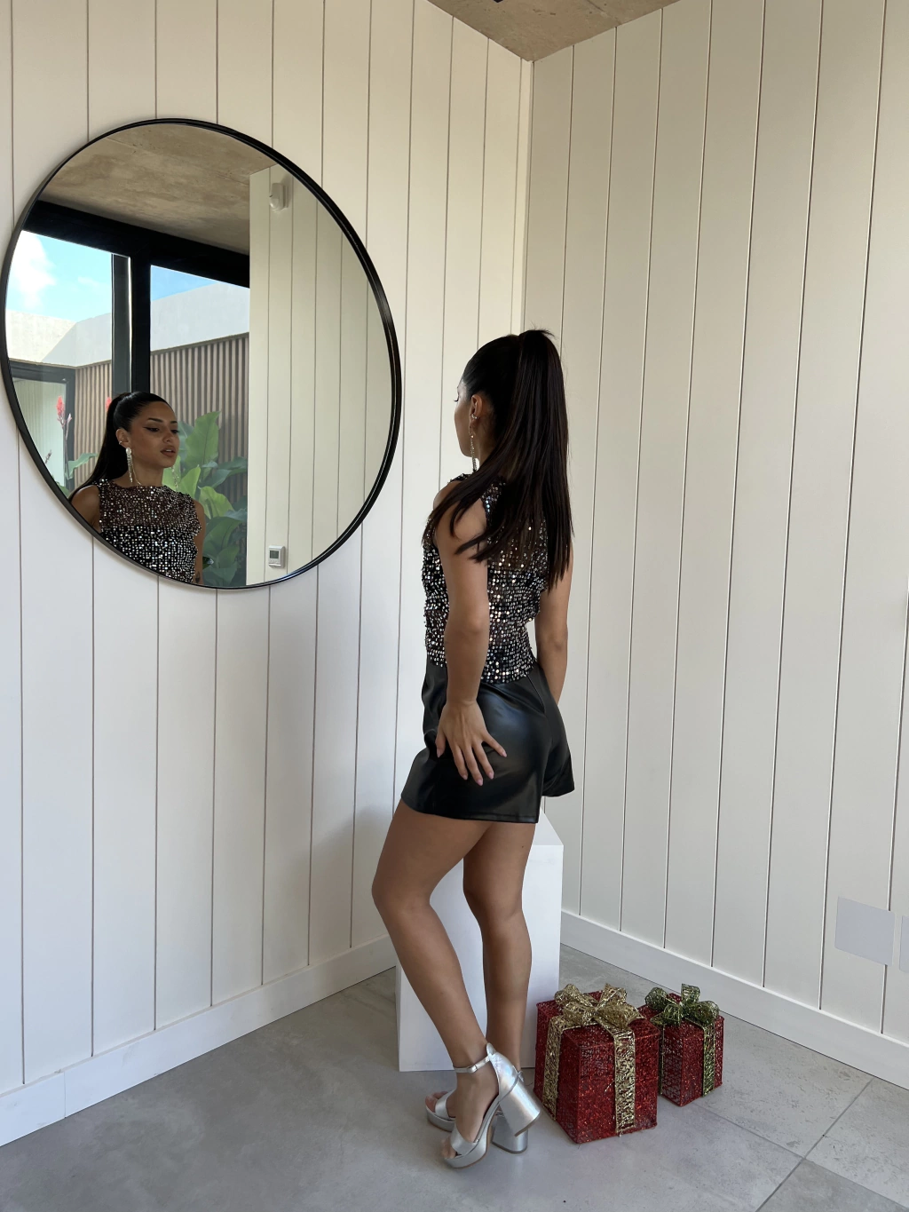 Tela cuerina. Color negro. Short atras / pollera adelante. Tiro alto.