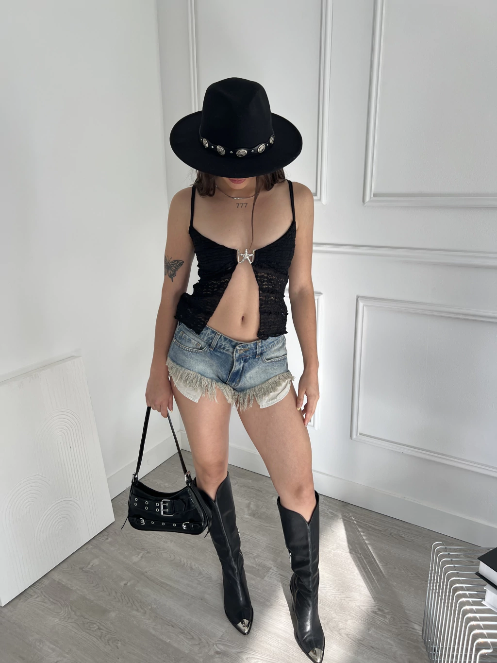 Tela encaje tramada. Hebilla adelante estrella de mar. Abierto adelante. Talle unico.