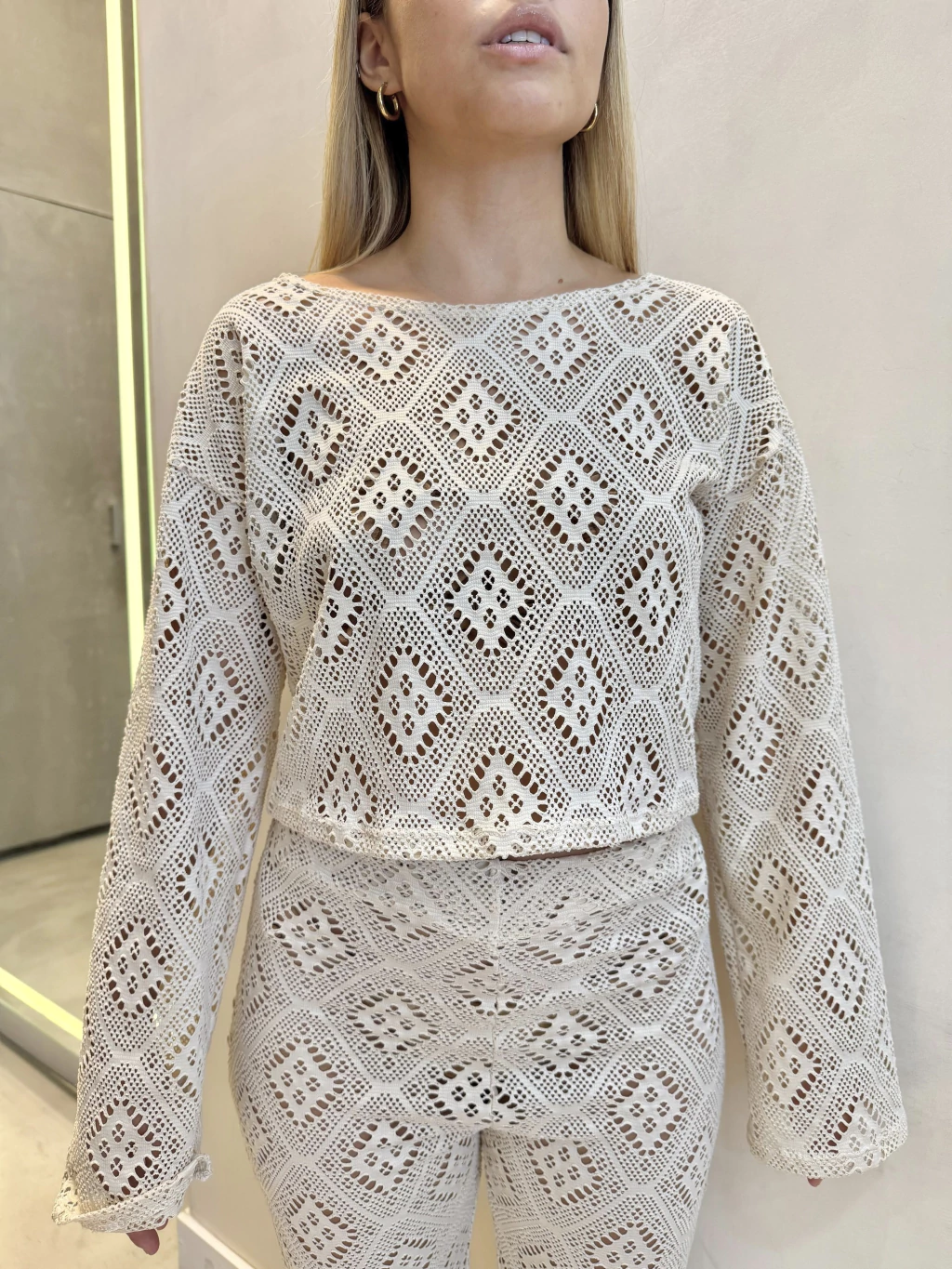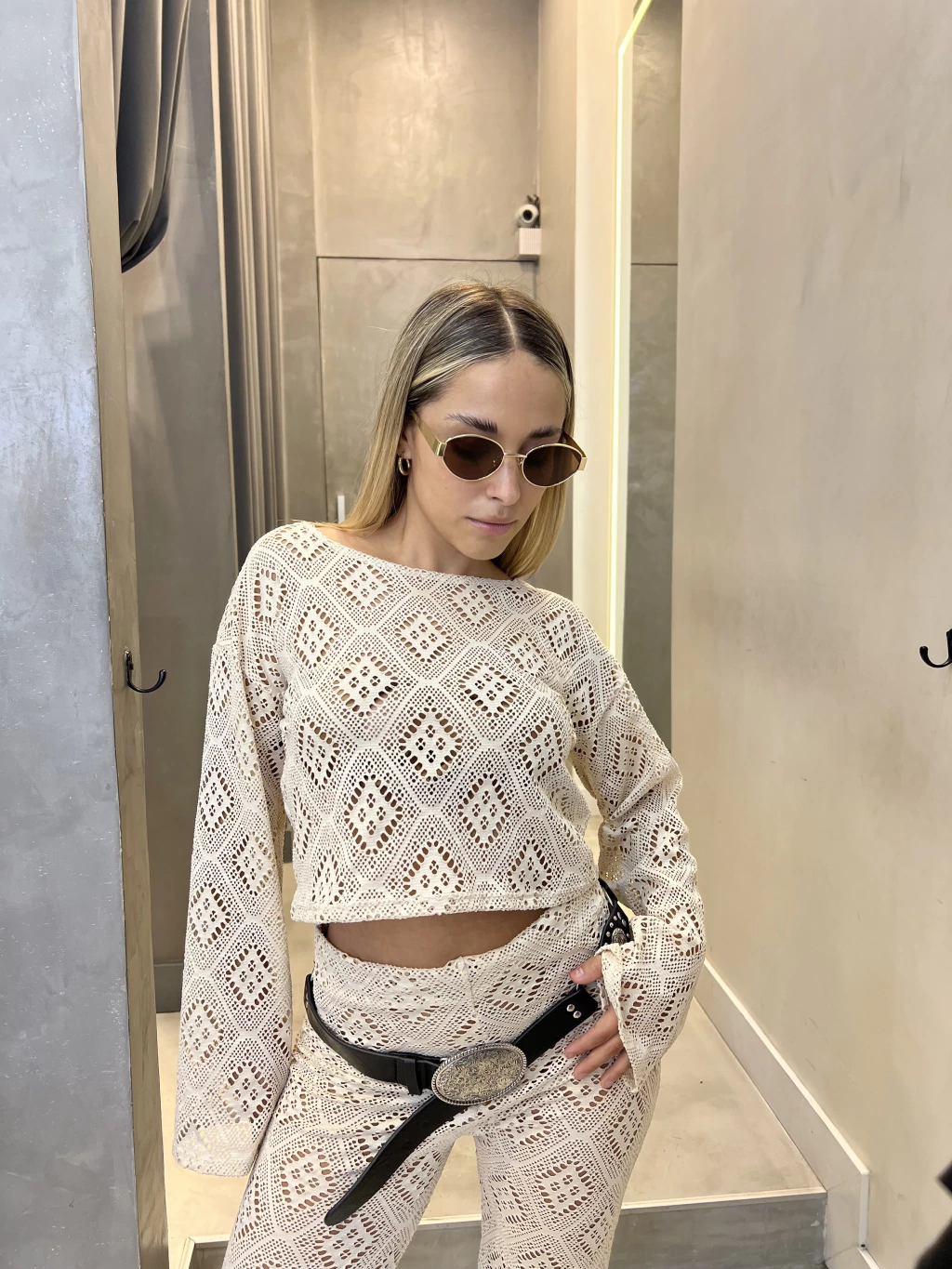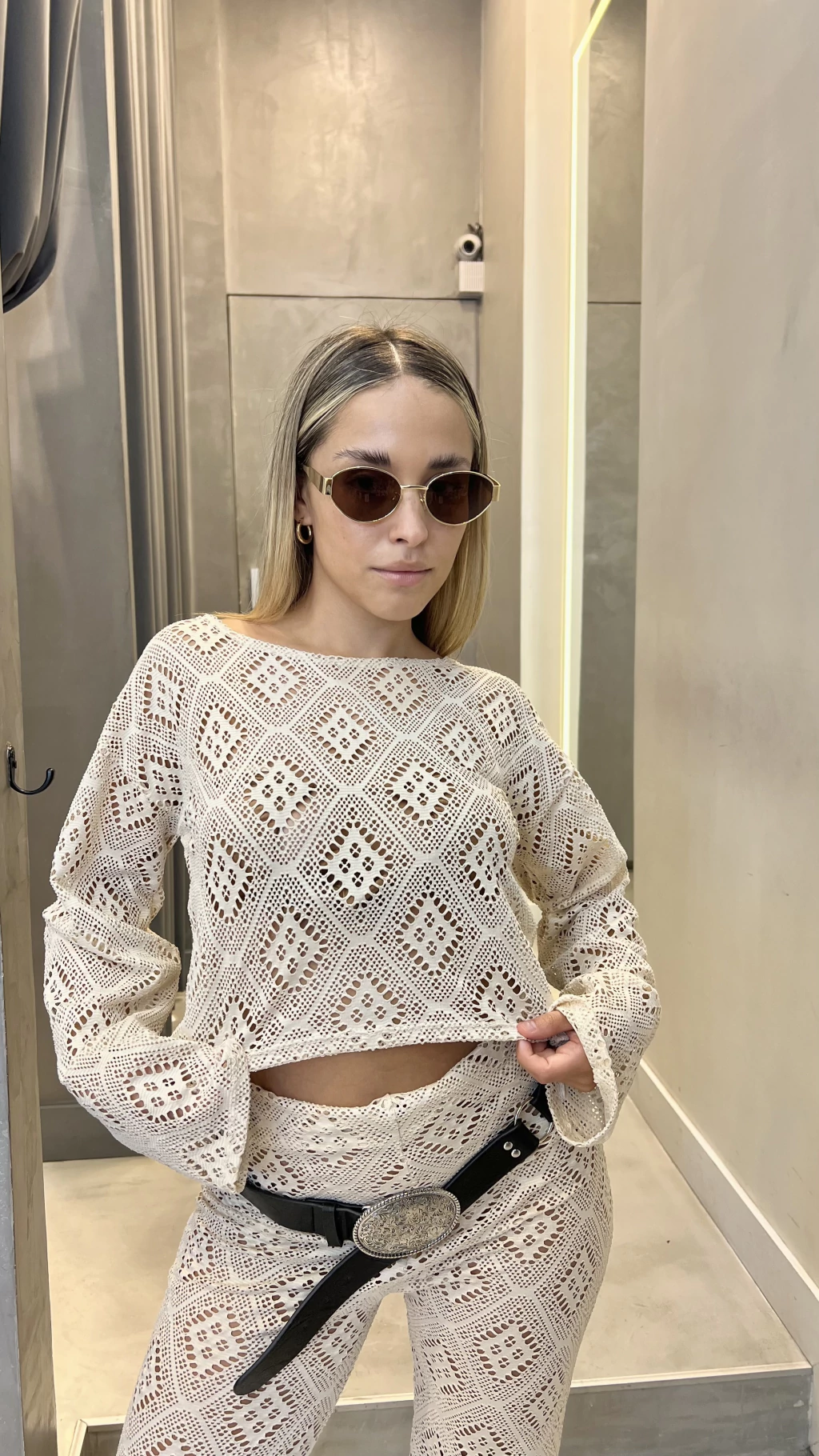 Tela crochet calado. Sueltito. A la cintura. Talle unico amplio.