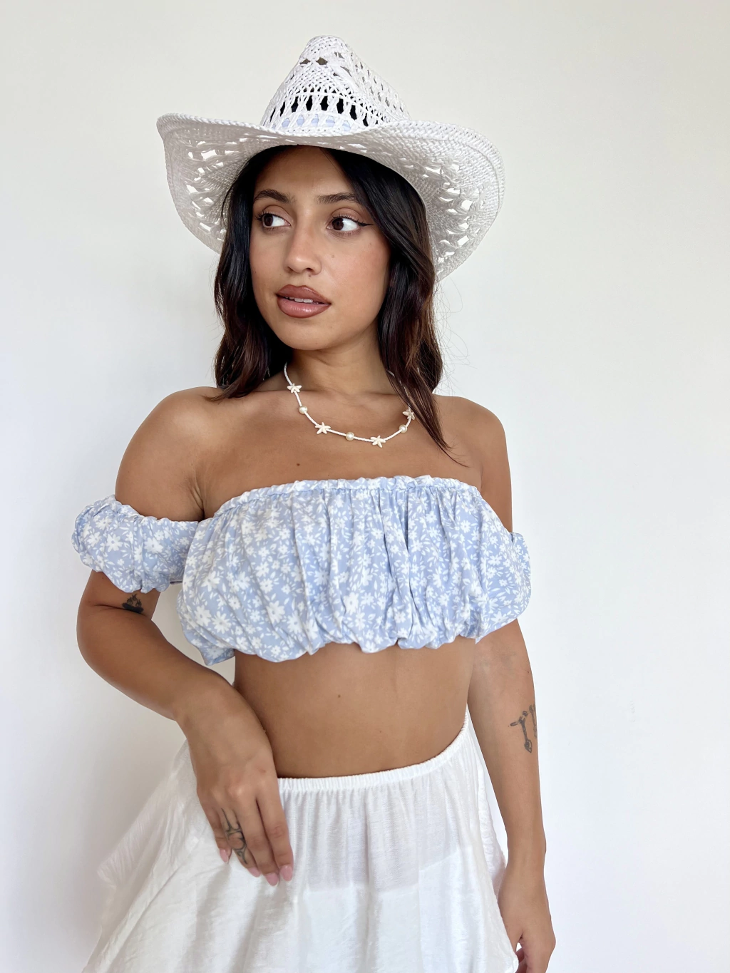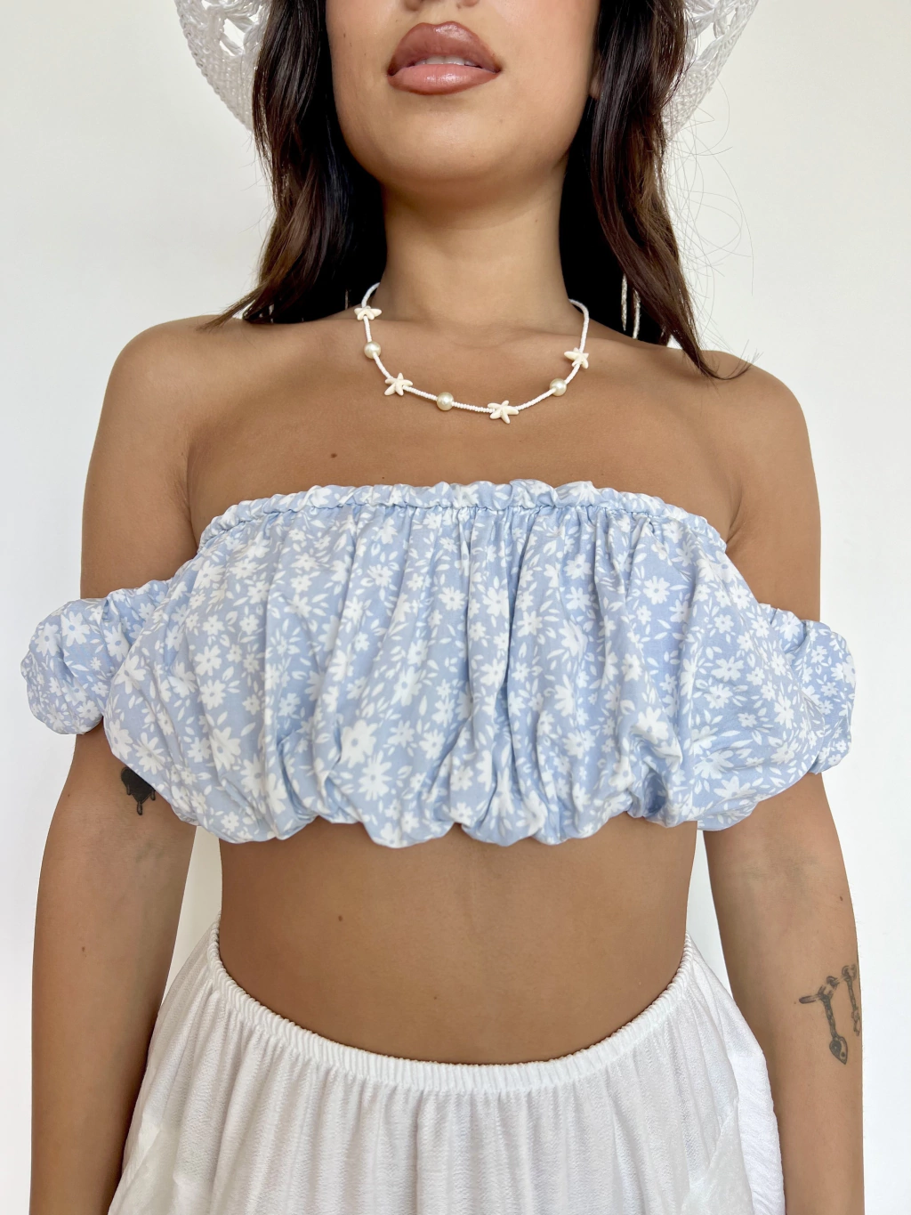 Tela lino. Estampa florcitas blancas. Hombro caidos con elastico. Straples. Talle unico amplio