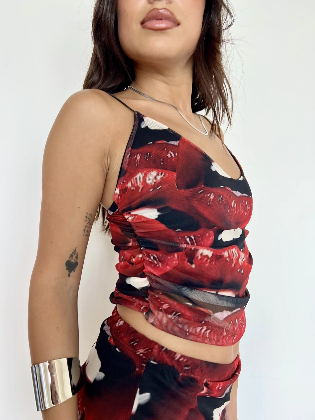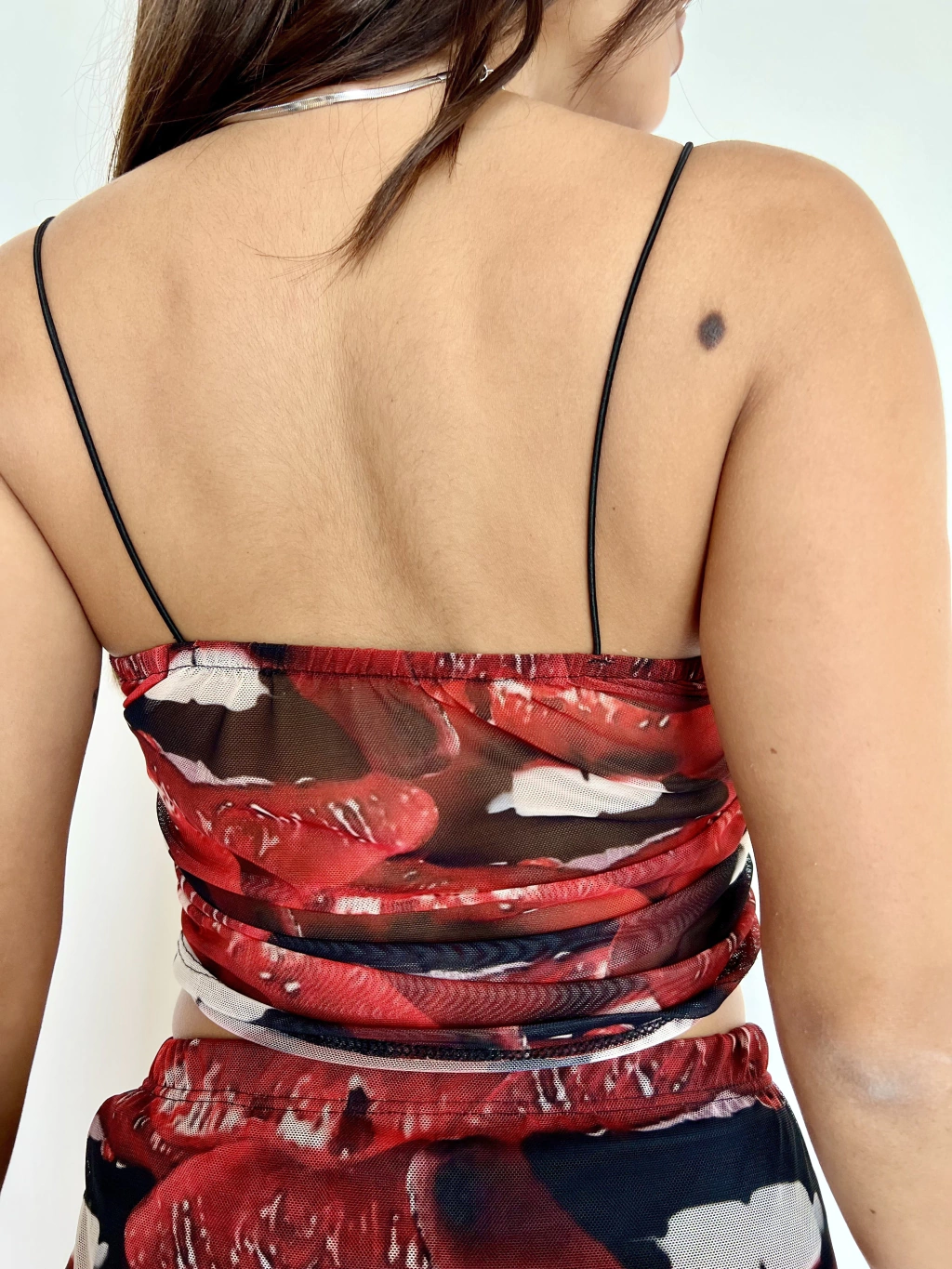 Tela tul. Bretel colita raton. Al cuerpo. Tiene forro negro debajo. Frunce lateral. Estampa labios rojos. Talle unico
