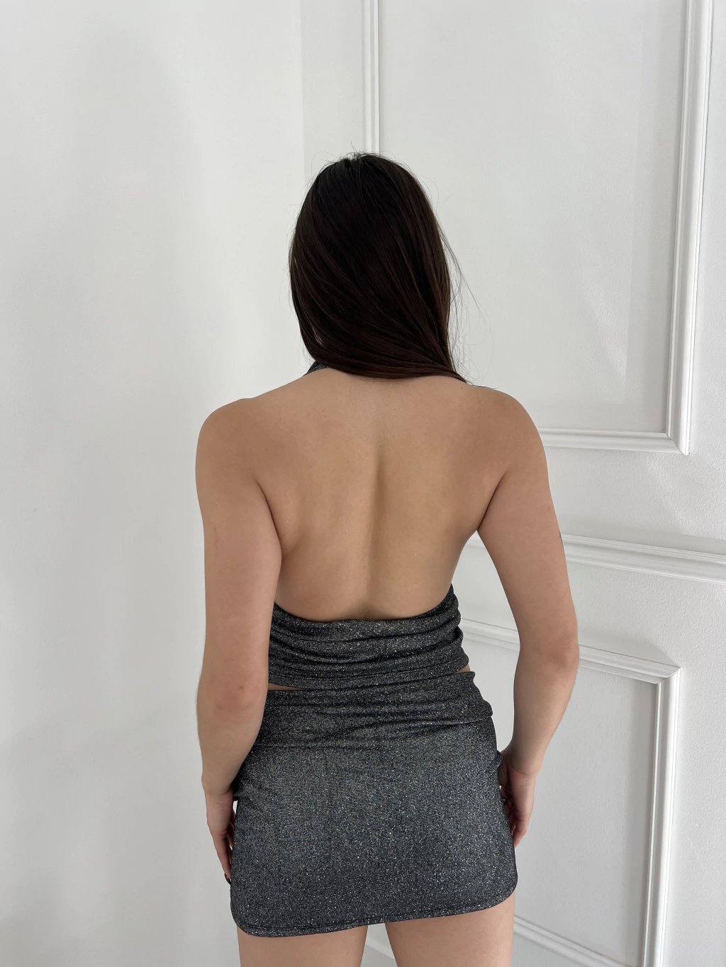 Tela con glitter (brillo). Corte Marilyn en escote. Espalda descubierta. Talle unico.