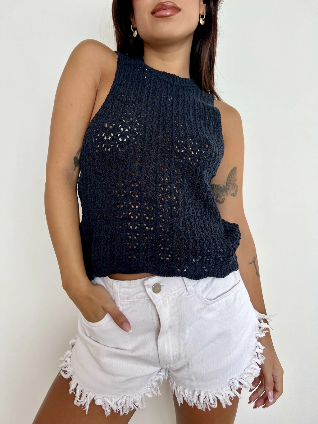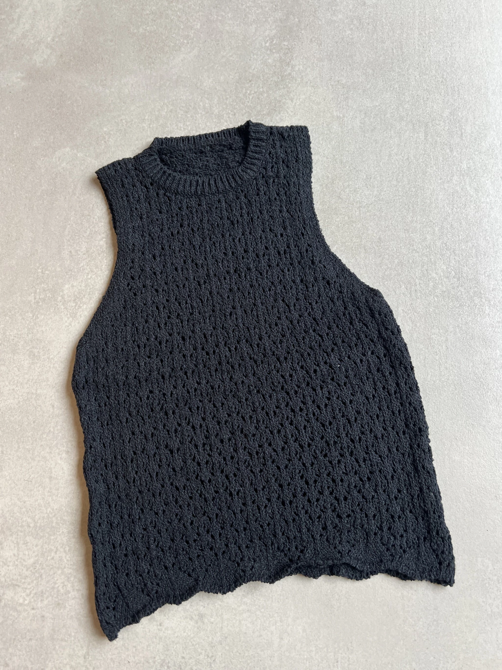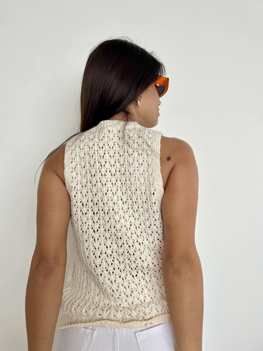 Tel hilo calado. Musculosa. Larga a la cintura. Cuello redondo. Talle unico amplio (abarca hasta un talle L)