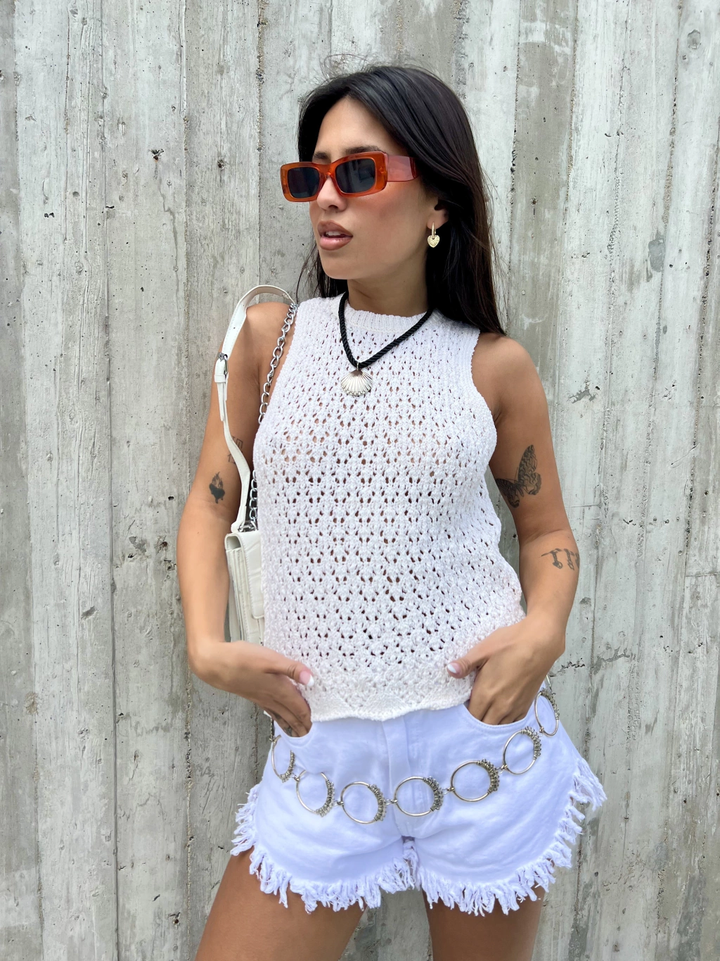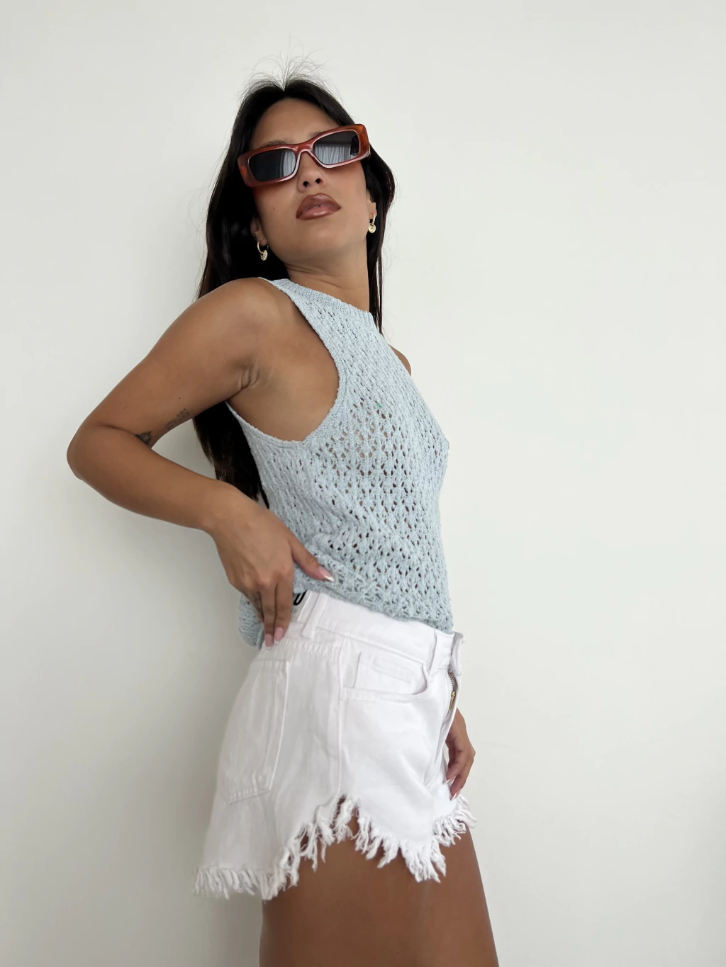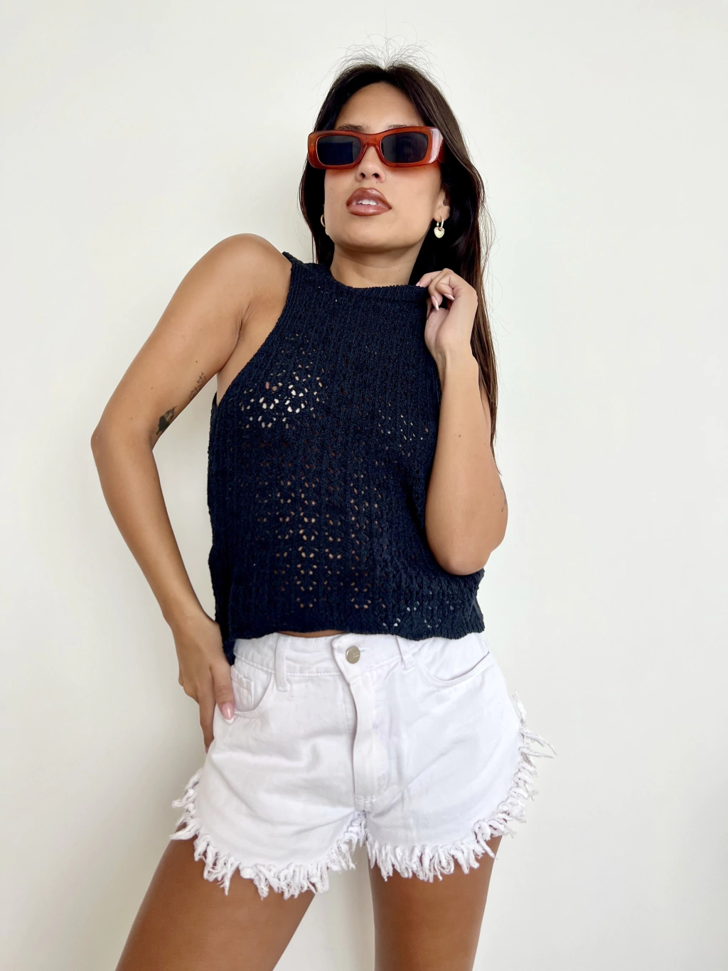 Tel hilo calado. Musculosa. Larga a la cintura. Cuello redondo. Talle unico amplio (abarca hasta un talle L)