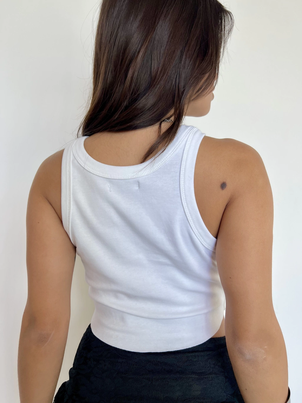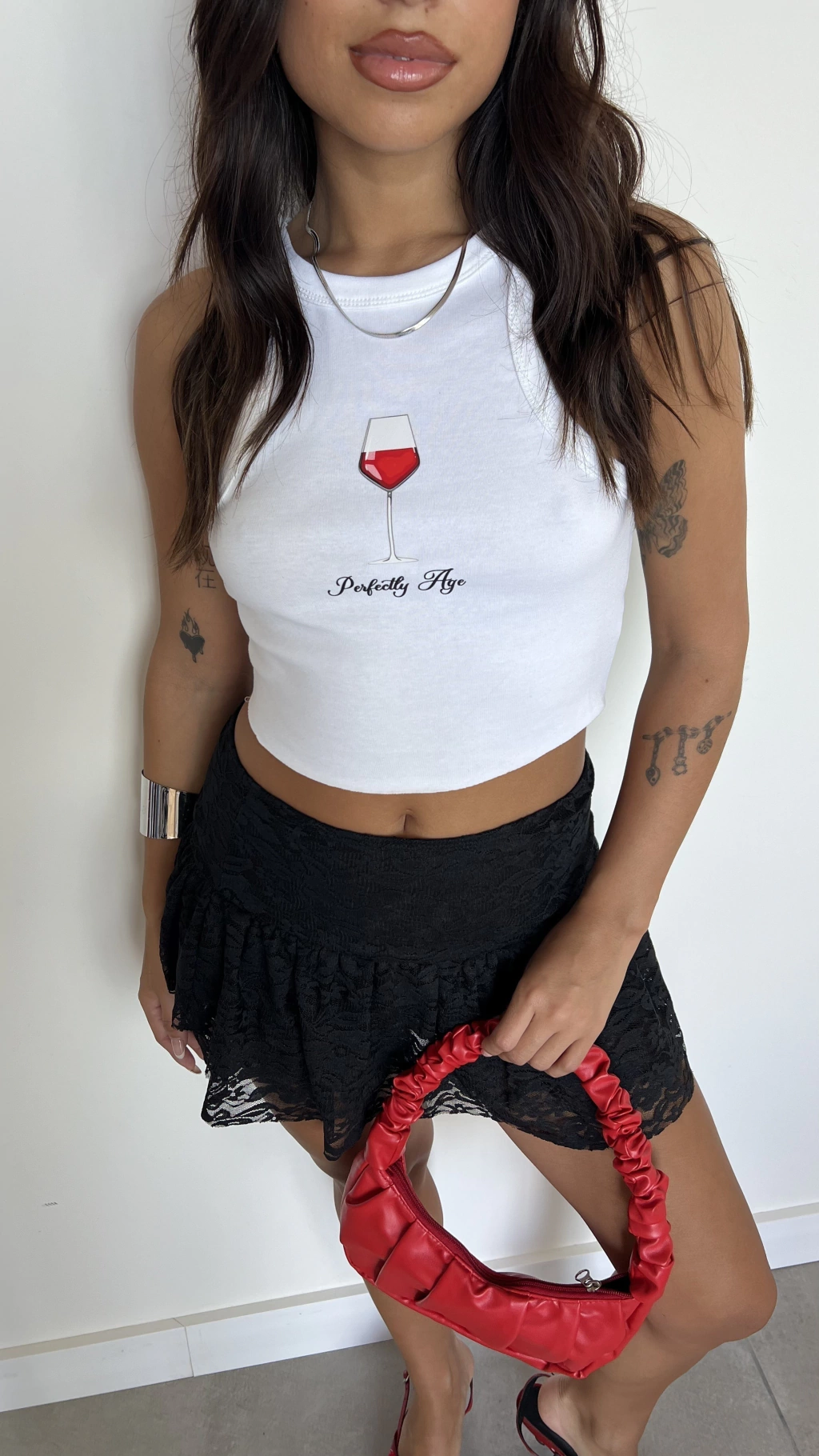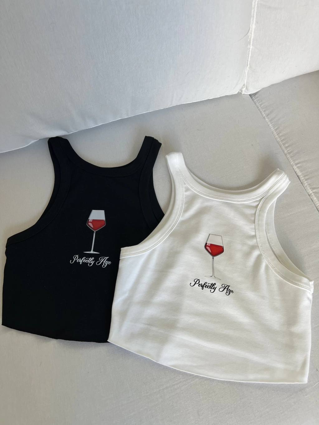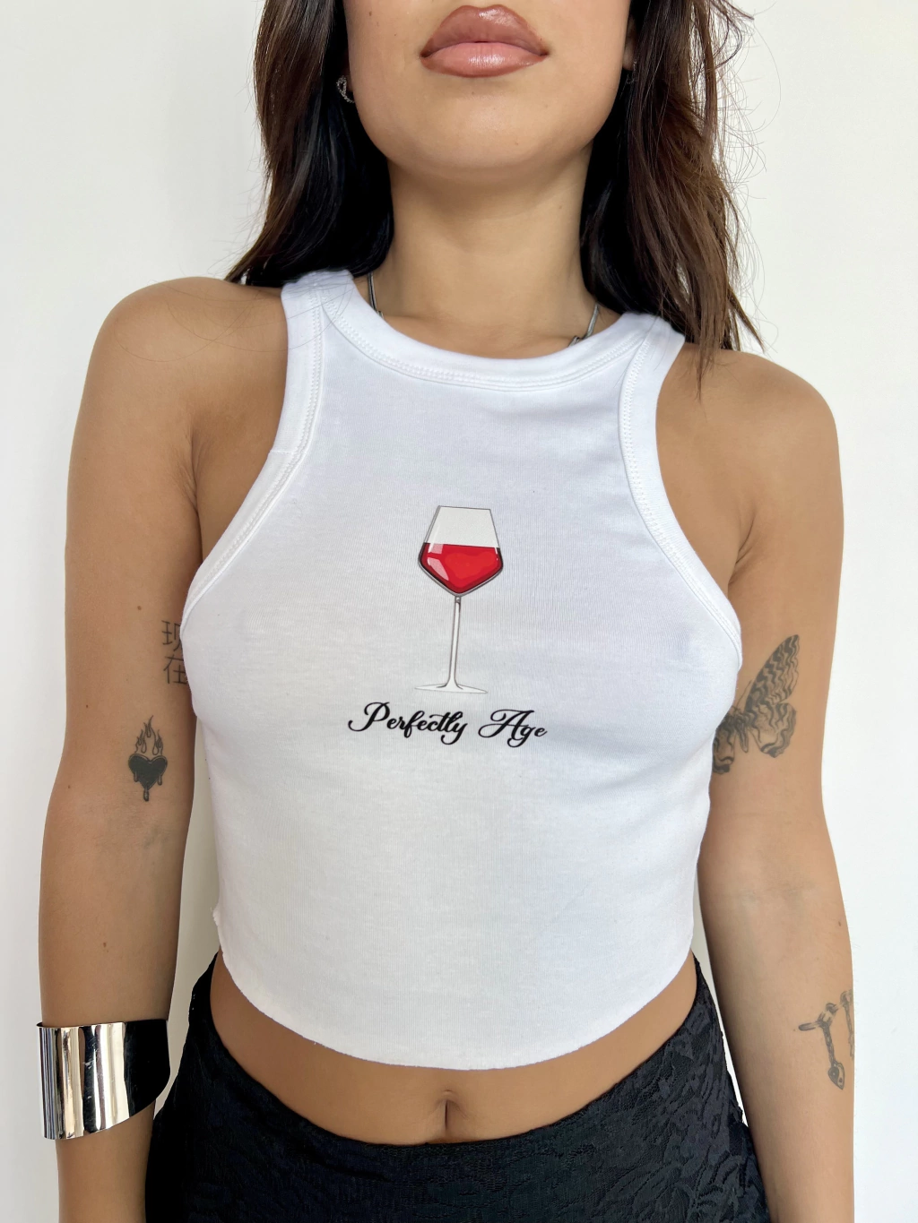 Baby tee musculosa. Al cuerpo. Tela algodón. Modelo corto. Estampa copa de vino.
