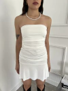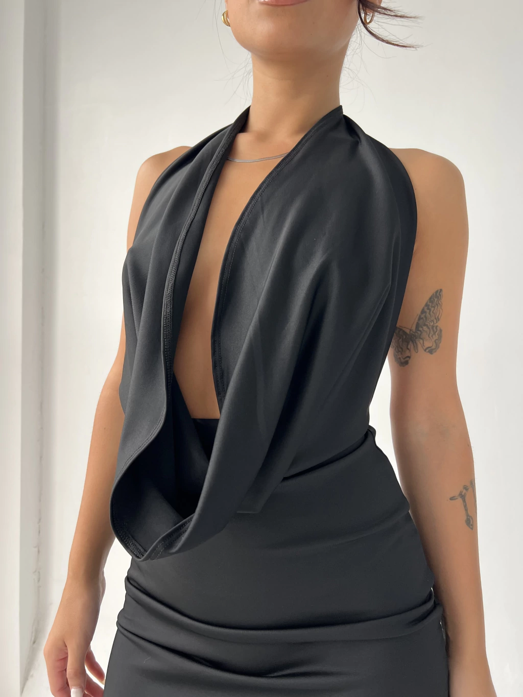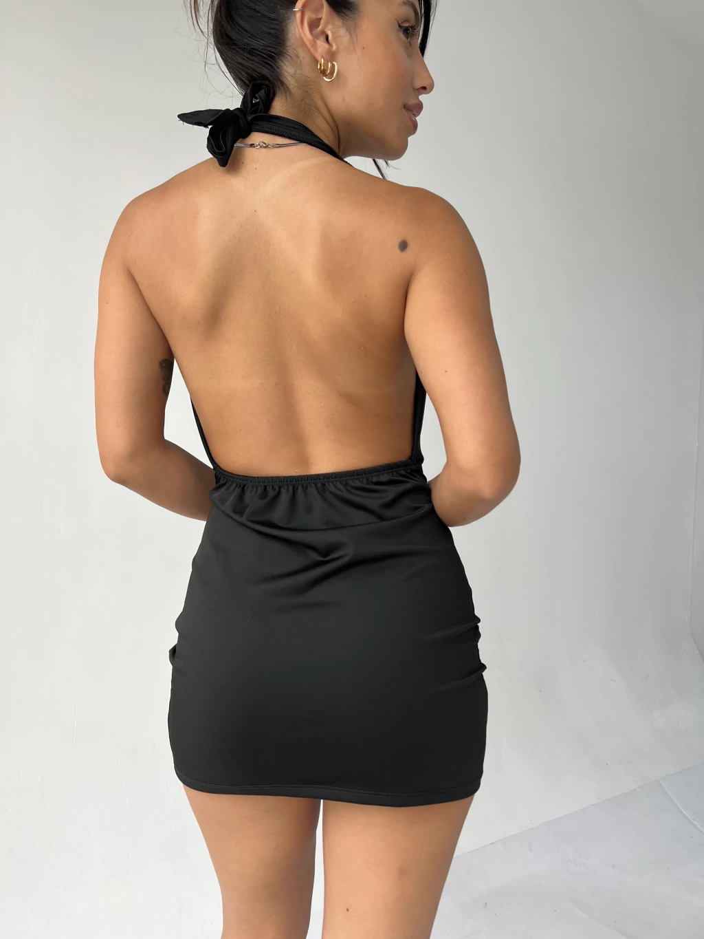 Tela crepe. Espalda descubierta. Buche adelante. Cuello para atar. Al cuerpo. Talle unico