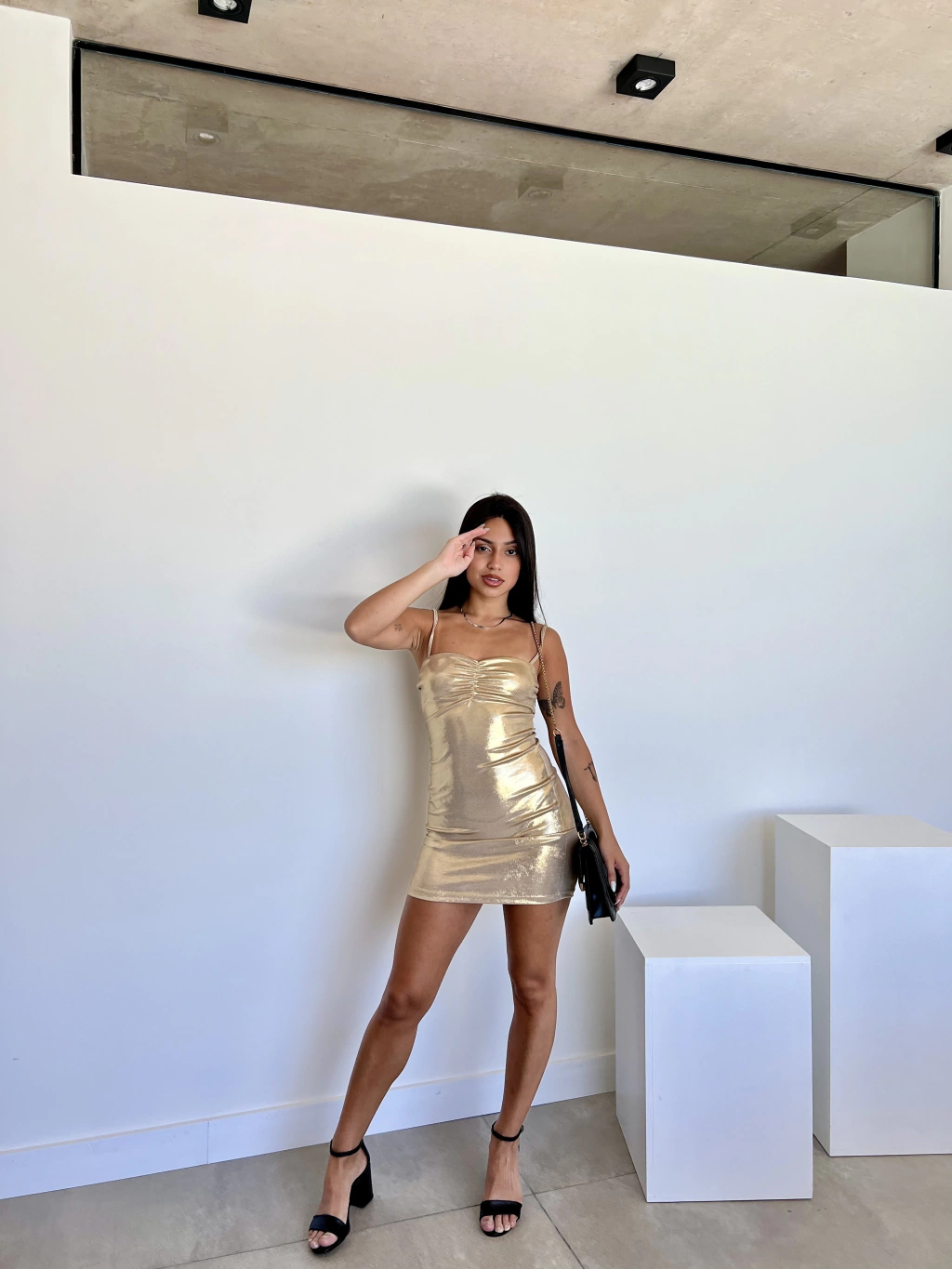 Tela foil. Al cuerpo. Talle unico amplio (la tela cede y llega hasta un talle L)